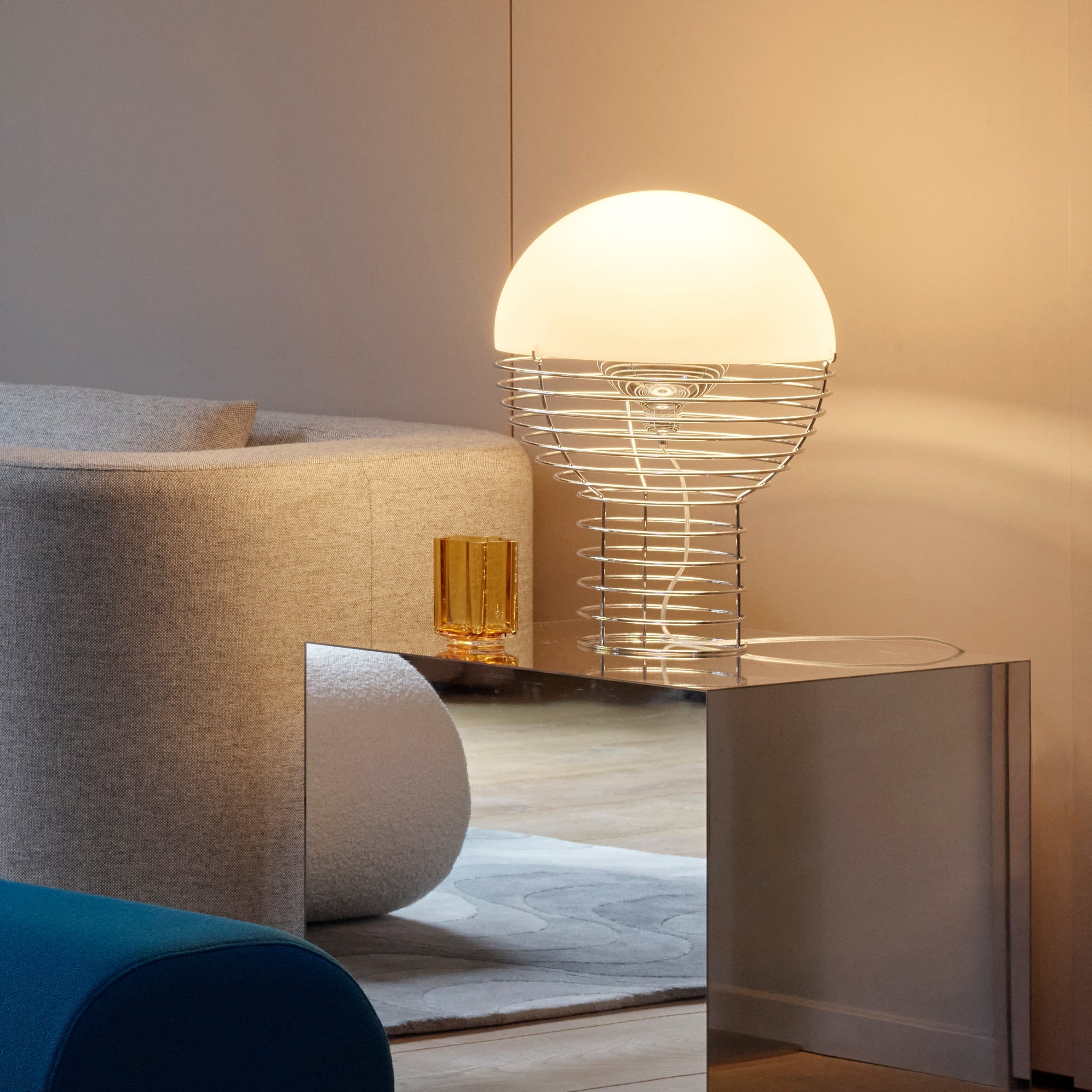 A spiral of wire rope widens to a hemisphere at the top in Verner Panton’s iconic 1972 table lamp. The legendary Danish designer often favored workaday materials and his Wire series underscores that aesthetic. Atop the cylindrical chrome-plated wire framework, a domed cap in polished white plastic serenely reflects the bulb’s glow.