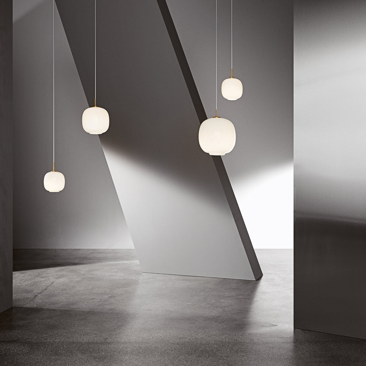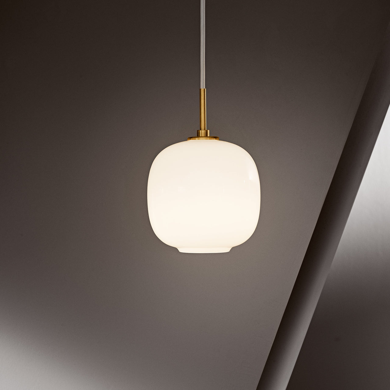 VL45 Radiohus made its name as lighting for the Danish broadcasting house when it opened in 1940s Copenhagen and, as with the original, the flawless pendant features a brass suspension as well as a curved shade made of 3 layers of handblown glass. The innermost and outermost layers are composed of transparent polished glass with an intermediate white layer, to provide gently even illumination—and this time honored Louis Paulson standard comes in 3 versatile sizes.