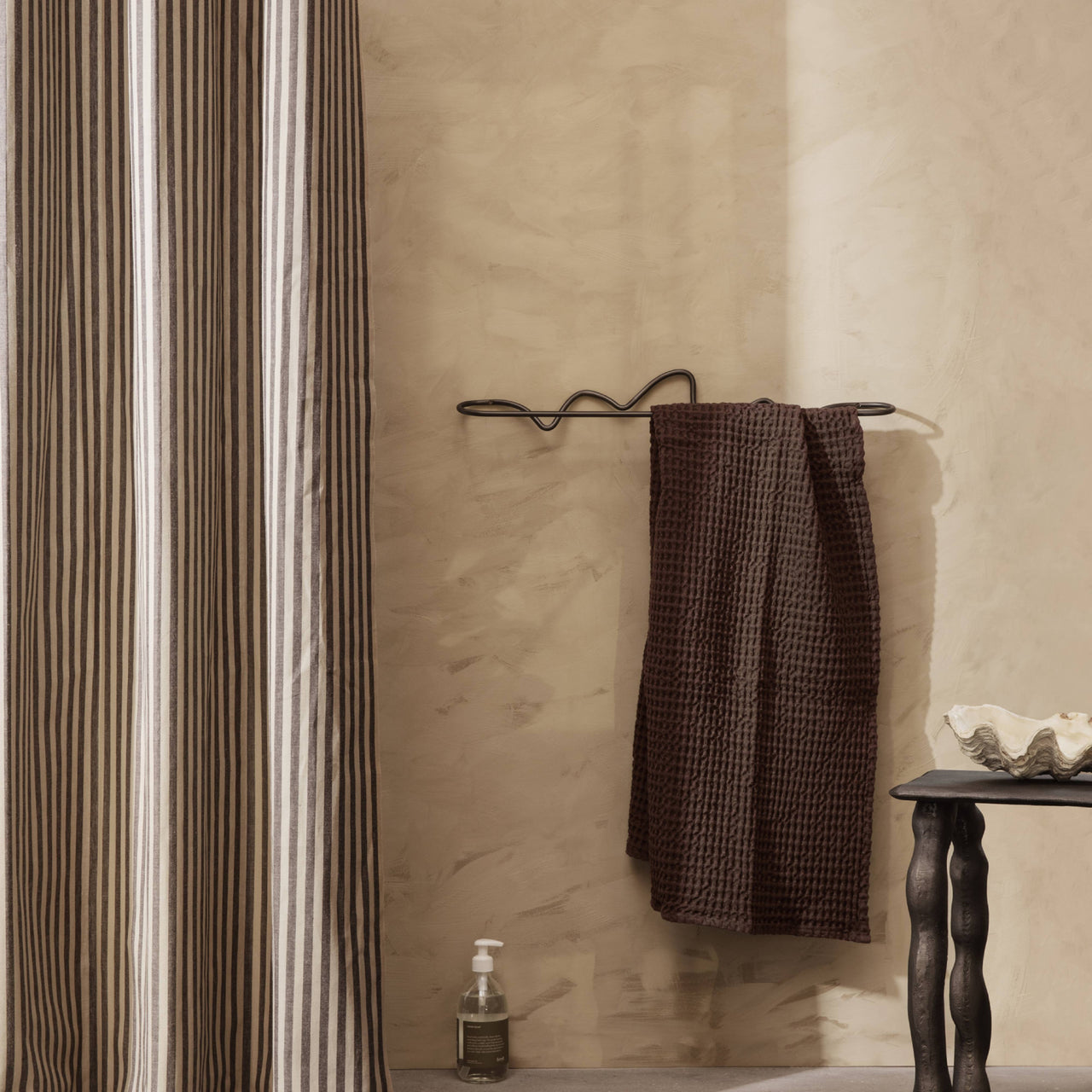 The Curvature Towel Hanger is handcrafted from solid brass with a matte lacquer finish. Each hanger features unique, whimsical curves that add a distinctive touch to any bathroom or kitchen. It's designed to hold towels securely while serving as a decorative element. Available in both Brass and Black Brass finishes, the hanger includes screws and raw plugs for easy installation.