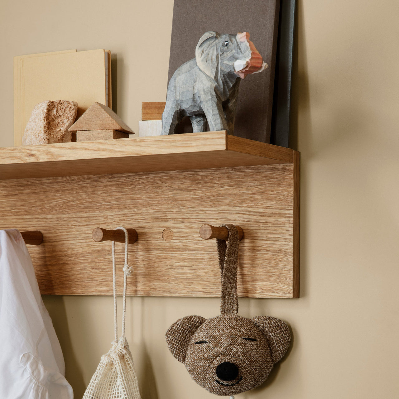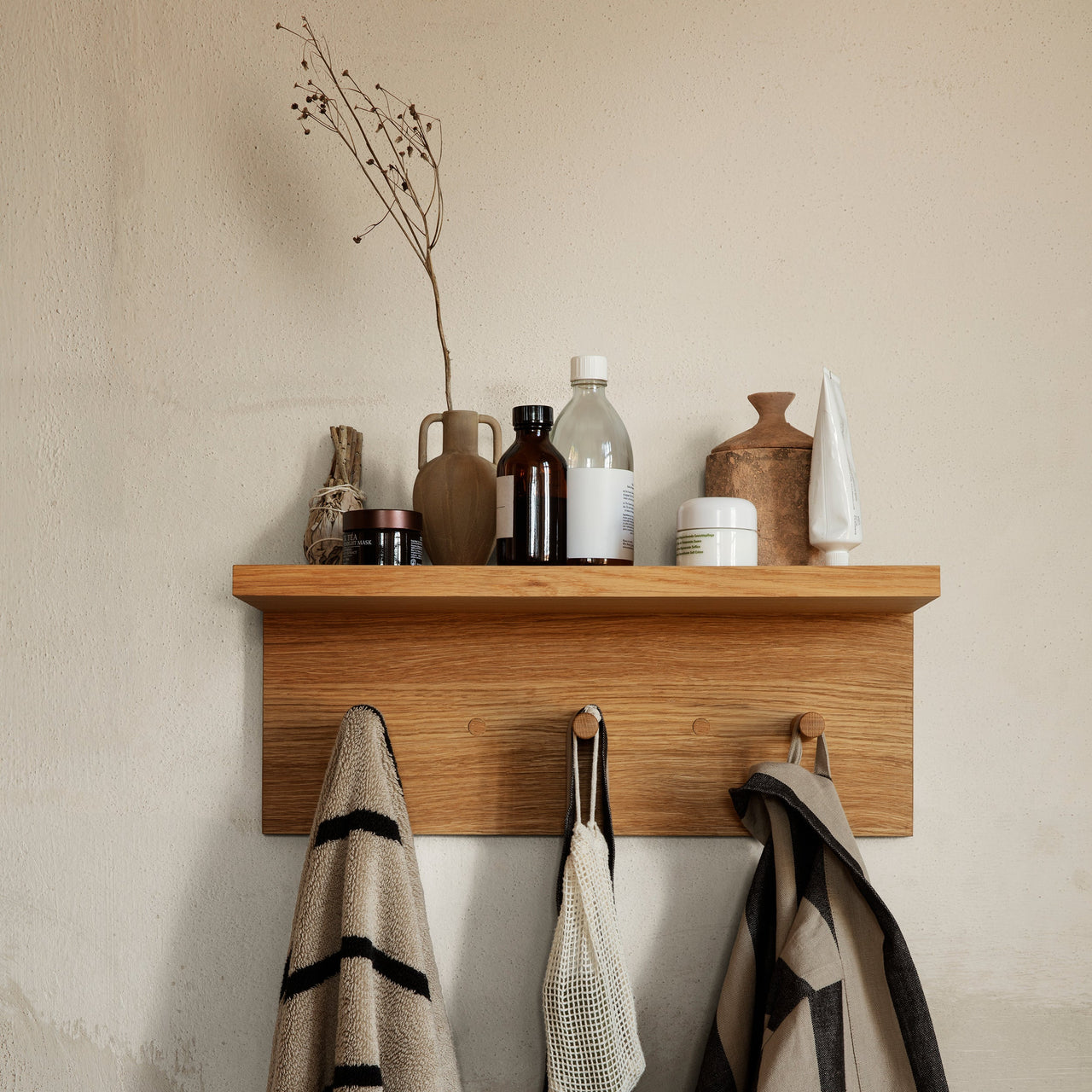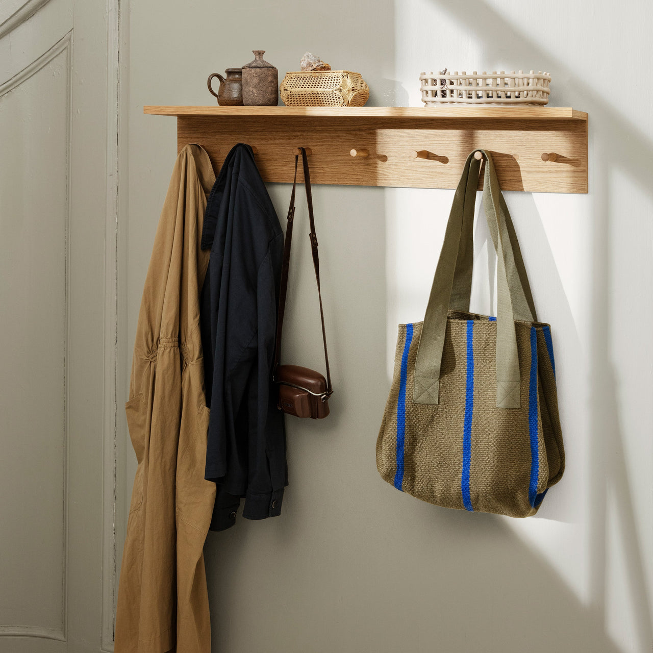 The Place Rack offers a versatile storage and display solution for various areas of your home. Crafted from oiled oak veneer with an MDF core, it features solid oak hooks and removable wooden caps for easy wall mounting. Available in 3 sizes, it adapts to spaces like the kitchen, hallway, or children's rooms.