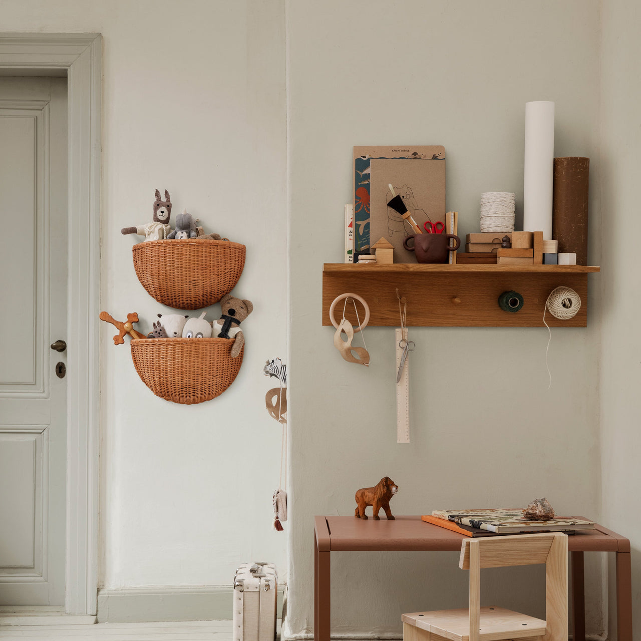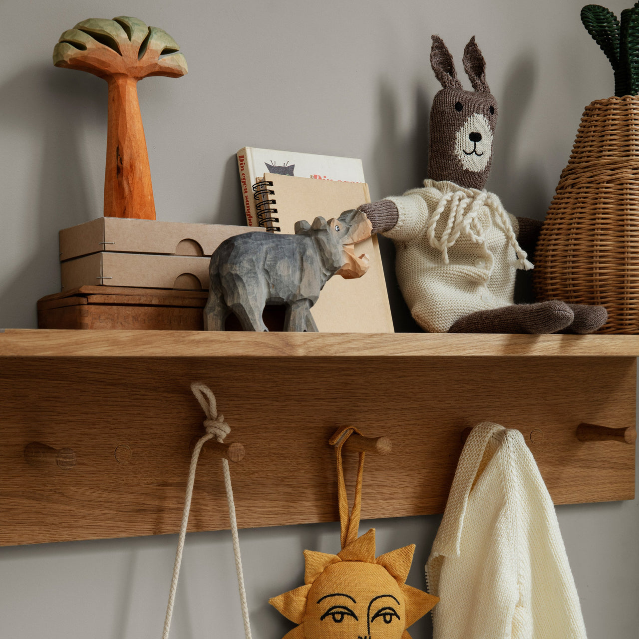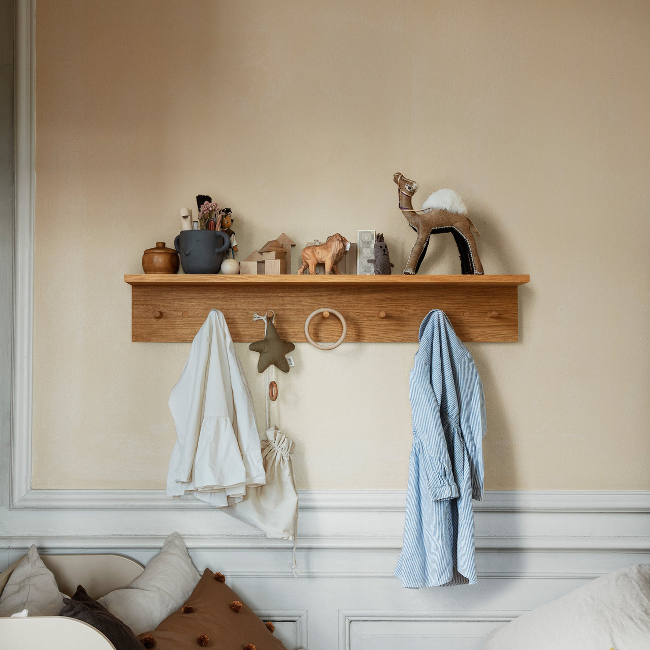 The Place Rack offers a versatile storage and display solution for various areas of your home. Crafted from oiled oak veneer with an MDF core, it features solid oak hooks and removable wooden caps for easy wall mounting. Available in 3 sizes, it adapts to spaces like the kitchen, hallway, or children's rooms.