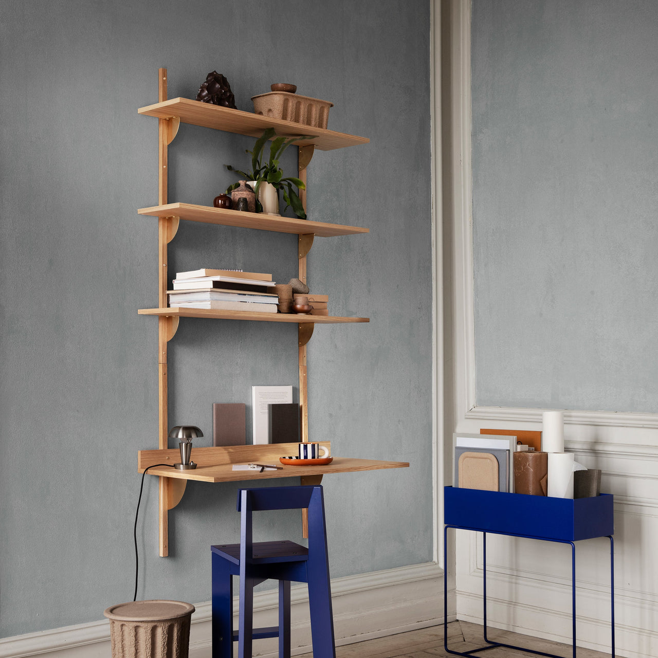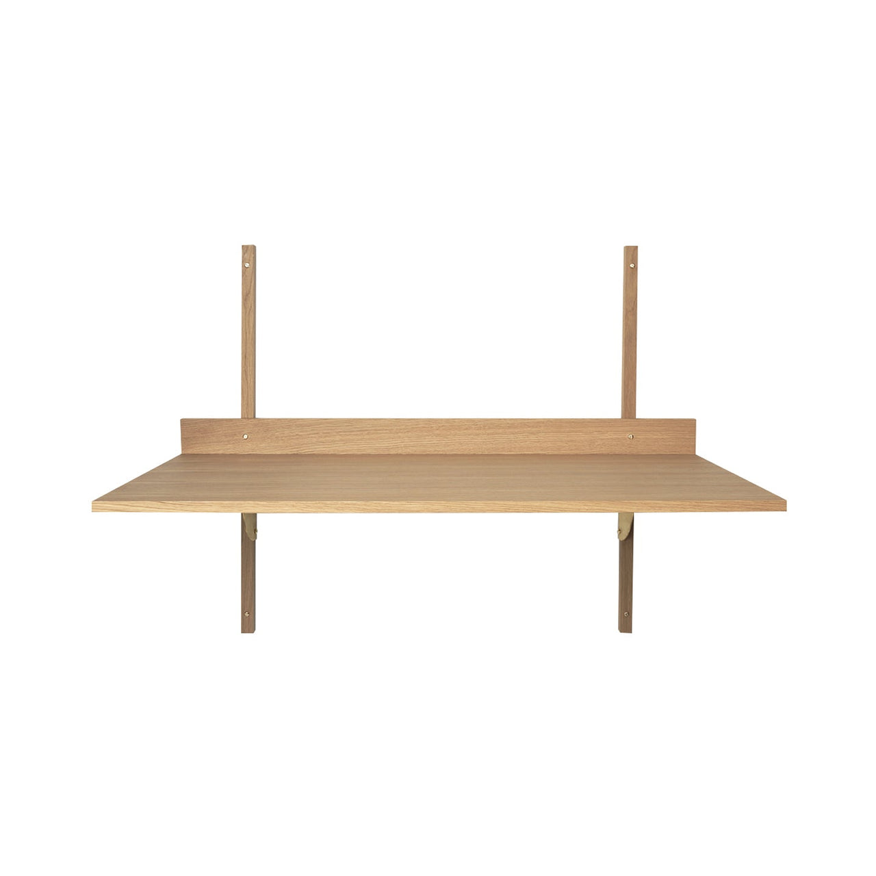 Copenhagen-based Ferm Living revives the midcentury wall-hung desk with a new verve. Sector is defined by its sturdy simplicity and classic functionality but adds the frisson of brass trim to the wooden surface. Use the desk by itself or combine it with Sector collection shelves to configure a cohesive workspace. The narrow inside ledge is ideal for propping up hand-written notes or a favorite photograph. Choose between natural oak veneer or black-stained ash veneer with brackets in either polished or blackened brass.