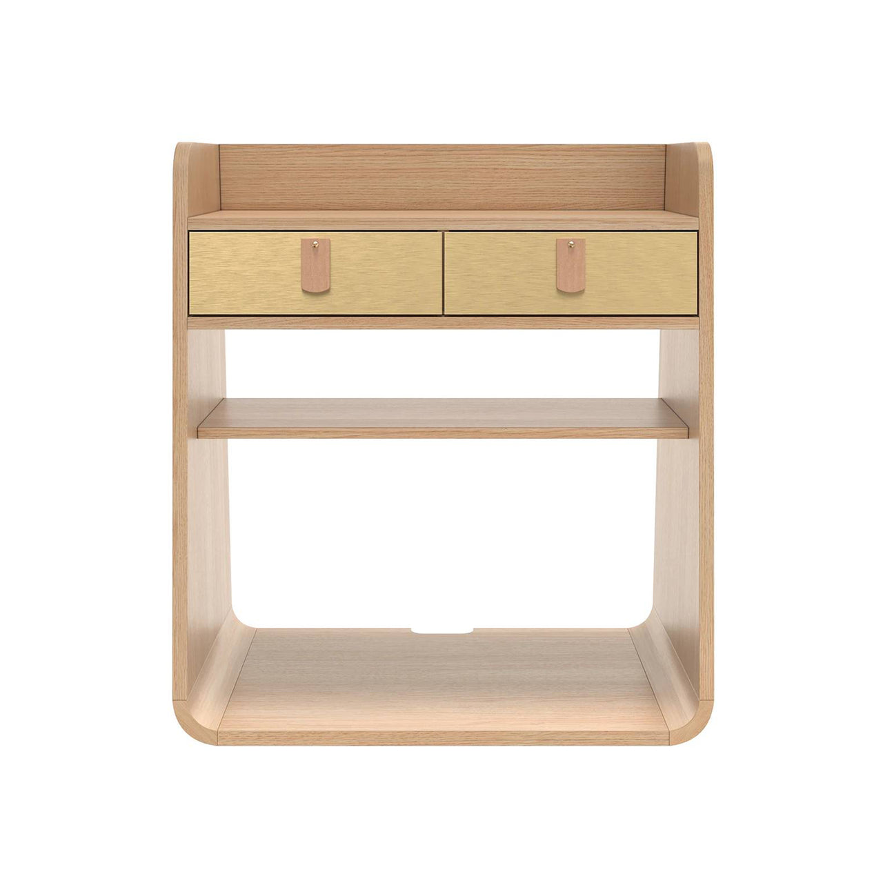 Suzon brings a touch of chic in a wall shelf complemented by drawers with contrast detail and leather pulls. French brand Hartô’s versatile oak-veneer unit can serve as a nightstand, hallway catchall or an extra shelf in the office. Designer Florence Watine’s storage scheme includes 3 shelves for keeping everything organized.