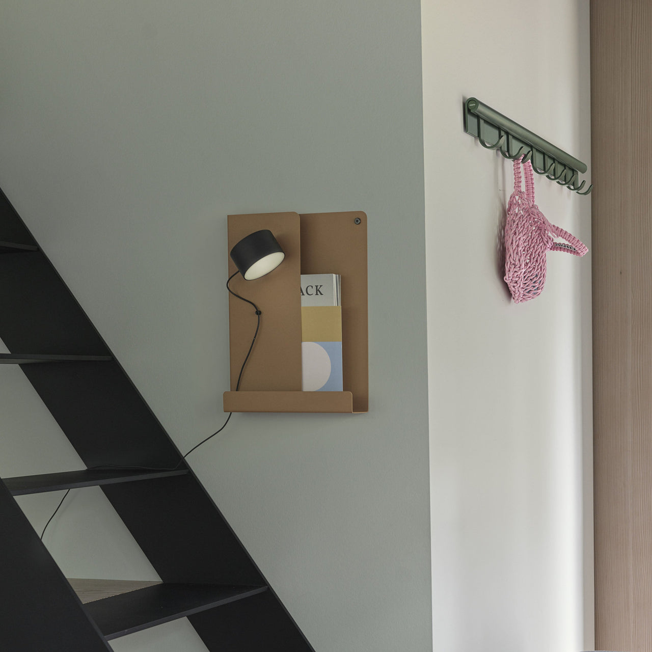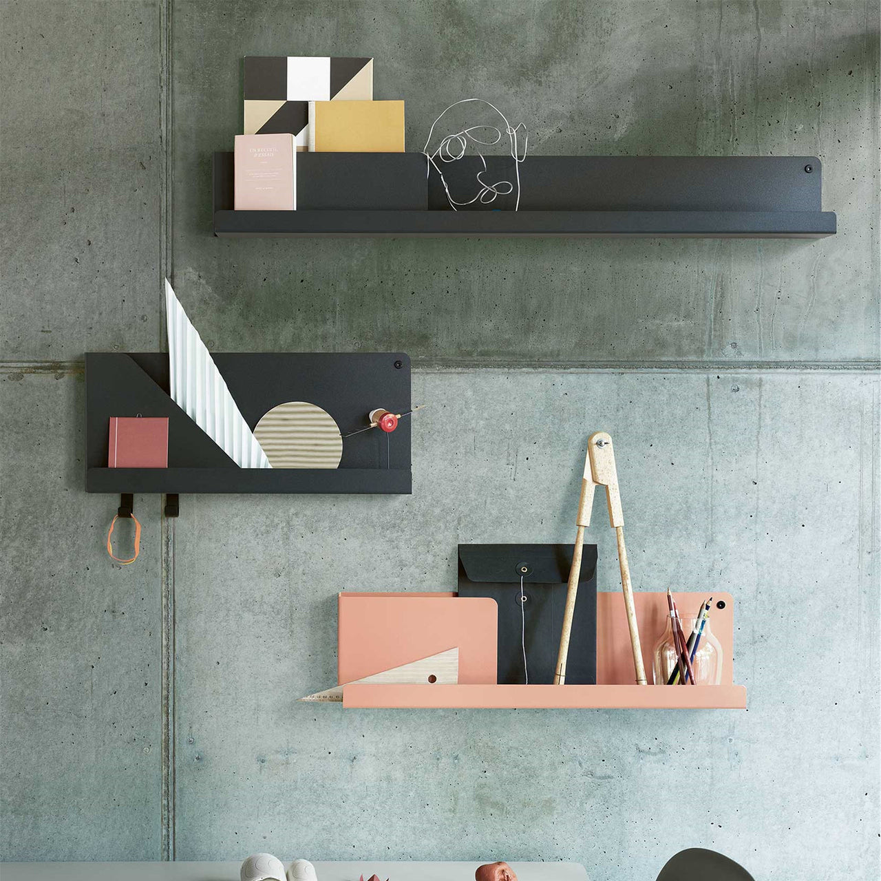 Designer Johan van Hengel bends his Folded Shelves into shape with just a single sheet of metal. Creating storage pockets much like a paper envelope to hold and separate items, his wall shelf from Copenhagen's Muuto features gently rounded corners and contrasting mounting bolts and hooks for hanging scarves and keys. A useful and modern storage solution for nearly any room- think of it in the entry, the kitchen, the office or even bedside. Or create a personal display with treasured objects and artwork.