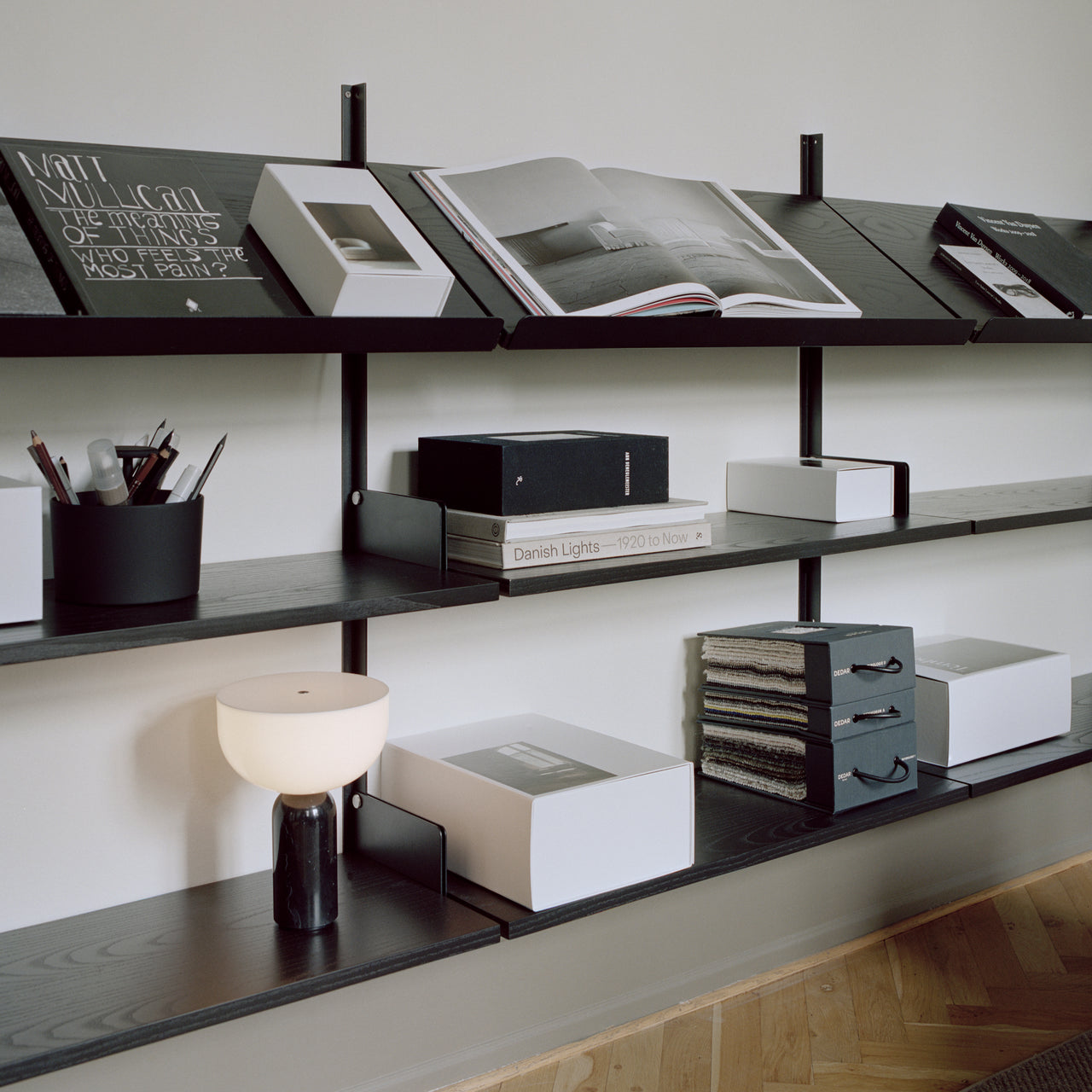With a slated top to hold reading matter and 2 additional double-wide shelves, creative director Knut Bendik Humlevik offers another variation on New Works’ signature wall system. With trim steel mounting bars that suit any number of spaces, the shelves in a lacquered white finish or woodgrain veneer are neatly assembled with flat knurled screws in stainless steel and feature integrated bookends to keep belongings in place.