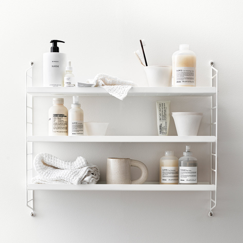 This compact wall-hung String configuration brings order to any size bathroom. The 3 metal shelves are rimmed to keep items from falling off and the perforated surface allows for add-on String accessories for personalized storage needs. A towel bar keeps everything neat and tidy and the shelving can be readily expanded as needed.