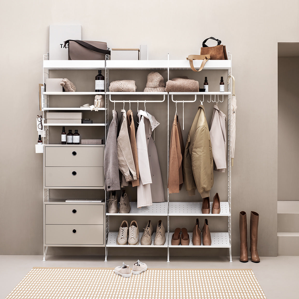 String has everything needed to kit out a medium-sized bedroom with this single-bay clothing storage. The preconfigured unit features a clothing rod, metal shelves up above with high and low edges for storing accessories and slanted shelves below for shoes. In fine-textured steel with a powder-coat finish in the familiar coated-wire structure, the unit also accommodates String add-ons like organizers, coat hangers and extra hooks (also available at A+R.) And it's infinitely expandable as needs grow and change, an enduring feature of Nils and Kajsa Strinning's 1949 modular concept.