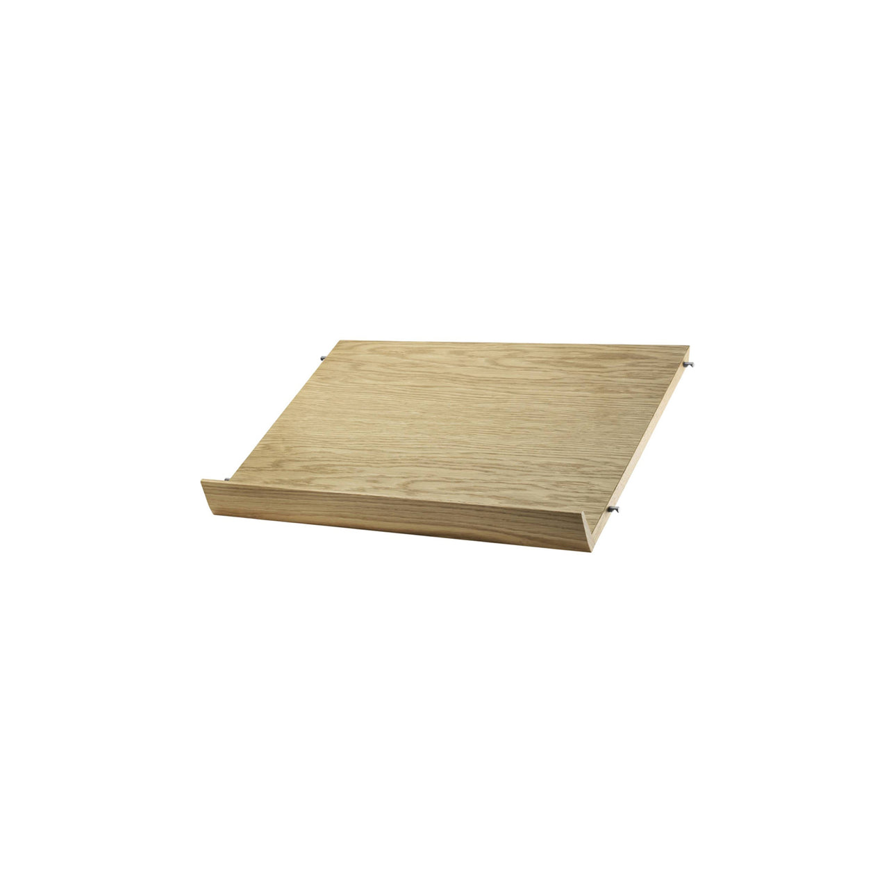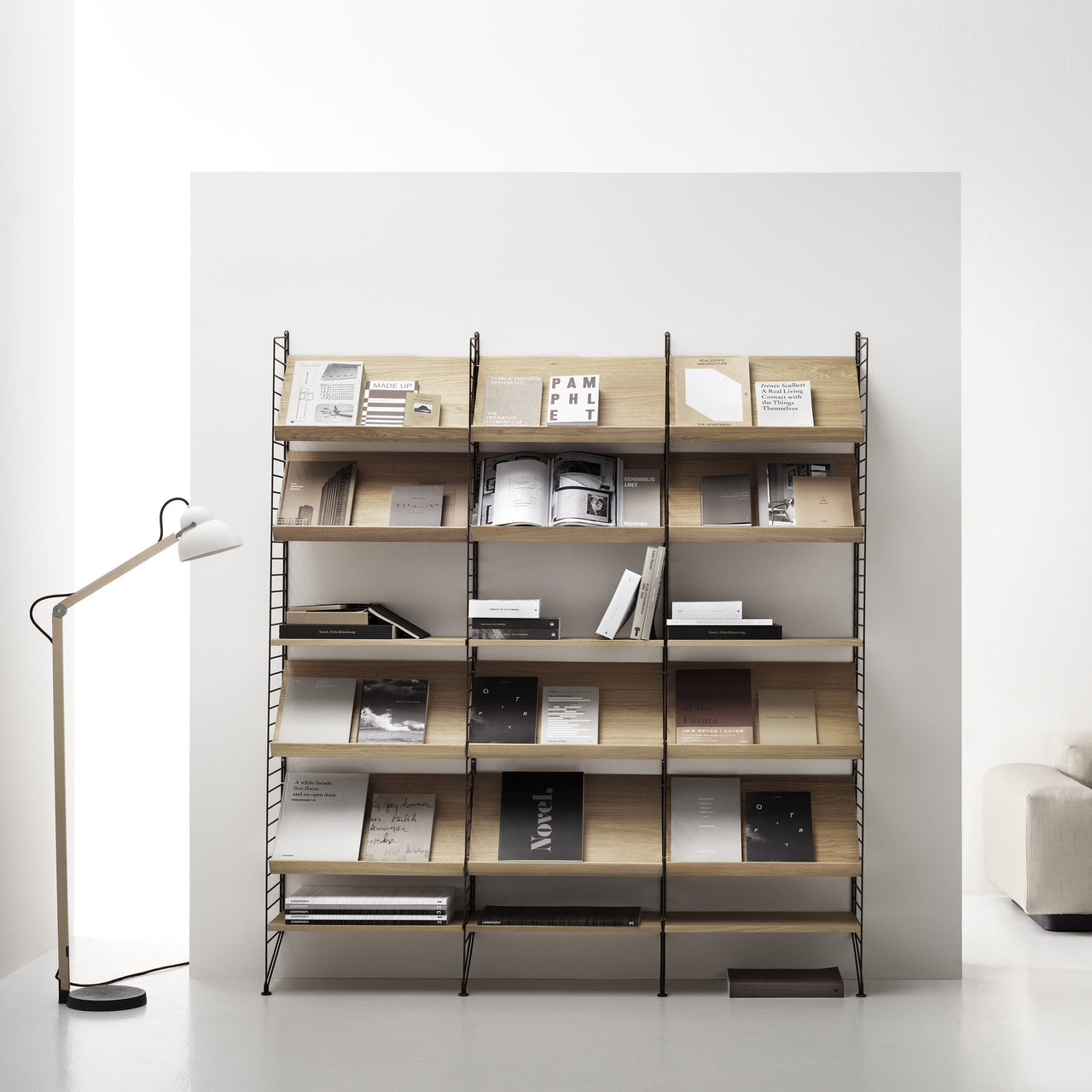 Another purposeful add-on for the String system is this angled shelf for magazines, in either lacquered wood veneer or solid colors. Besides a sheaf of periodicals, it might hold an open cookbook in the kitchen or reference work in a study. It’s yet another mark of the versatility of String’s iconic classic wire and plex panel shelving designed by Nisse and Kajsa Strinning.
