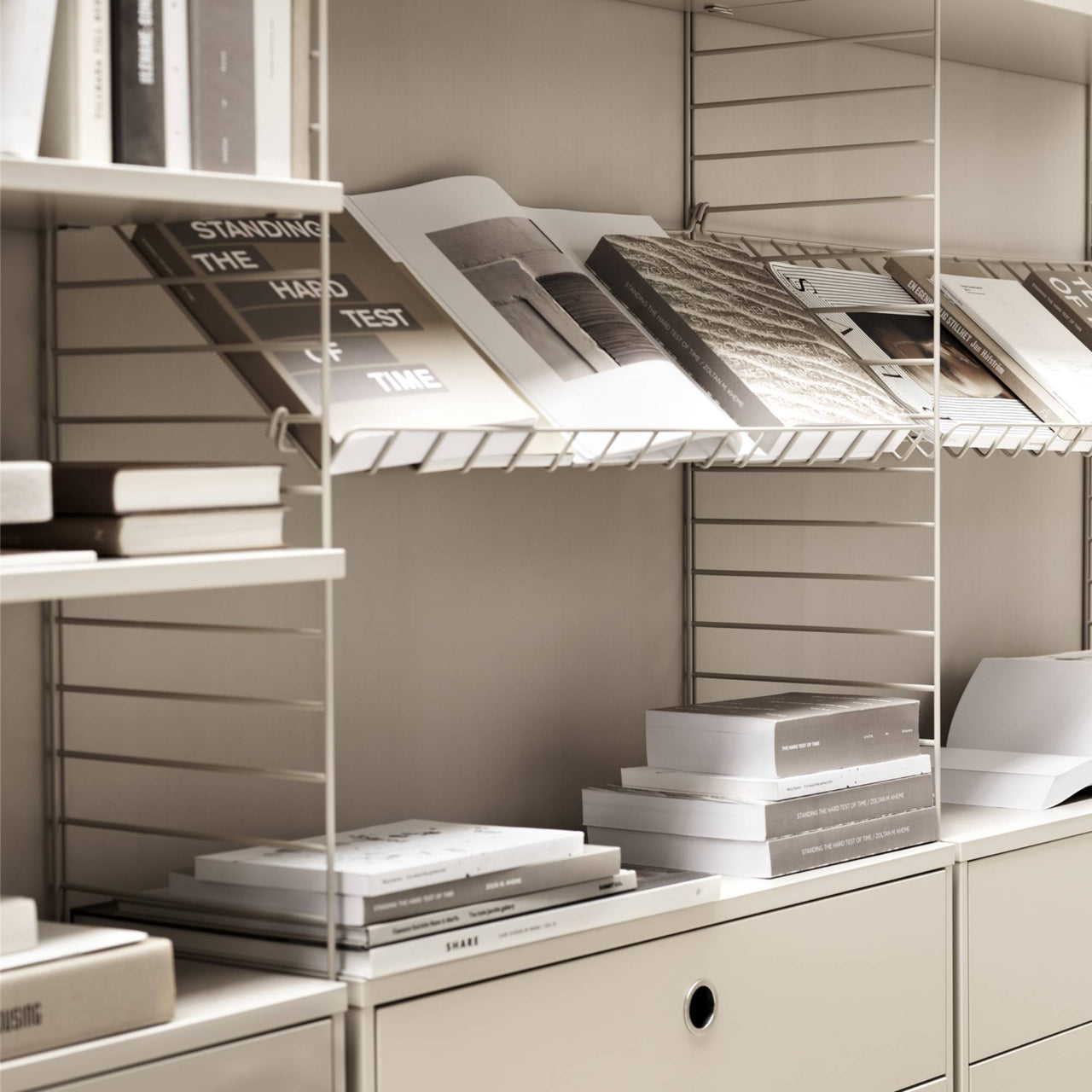 For a sheaf of magazines or perhaps to hold an open cookbook in the kitchen or show off a photo album, String offers an angled display shelf in its signature open metal wire. With a gloss powder-coat finish, it's available in 4 select hues to complement any chosen String wall unit. The thoughtful versatility of Nils and Kajsa Strinning’s iconic shelving system comes through once more with this useful addition.