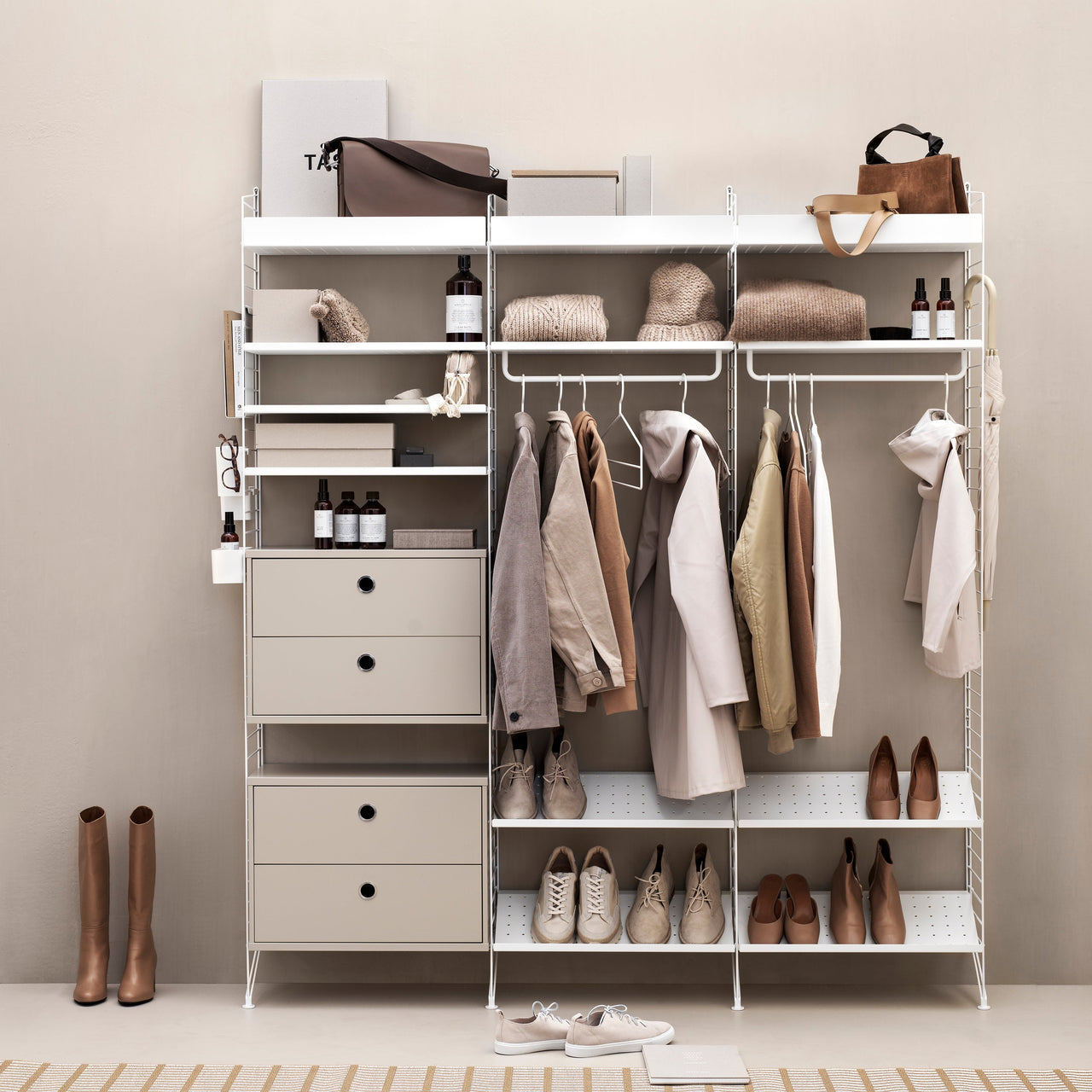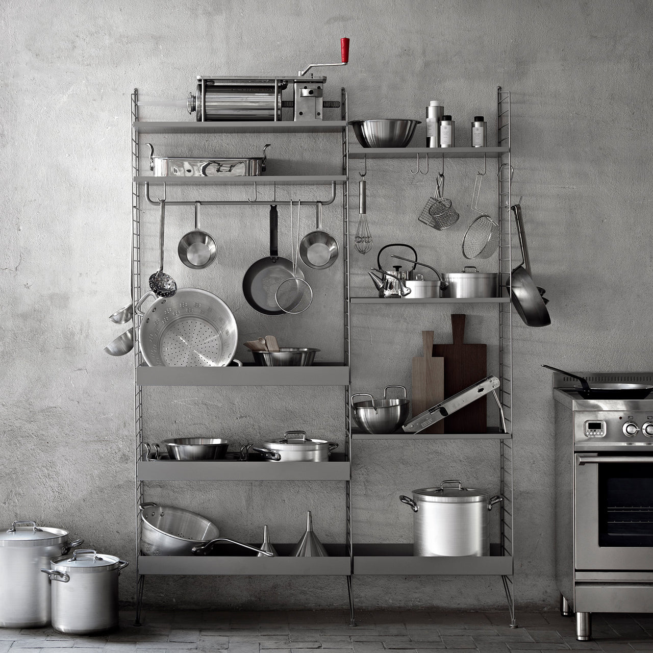 For extra functionality, String offers a shelf option in fine-textured coated steel that allows for an expanded range of storage solutions. The metal shelving can accommodate accessories like hooks, rods, hangar racks and bottle trays. Available in 2 versions, with either lower or higher edges, to provide maximum flexibility for all manner of customized installations.