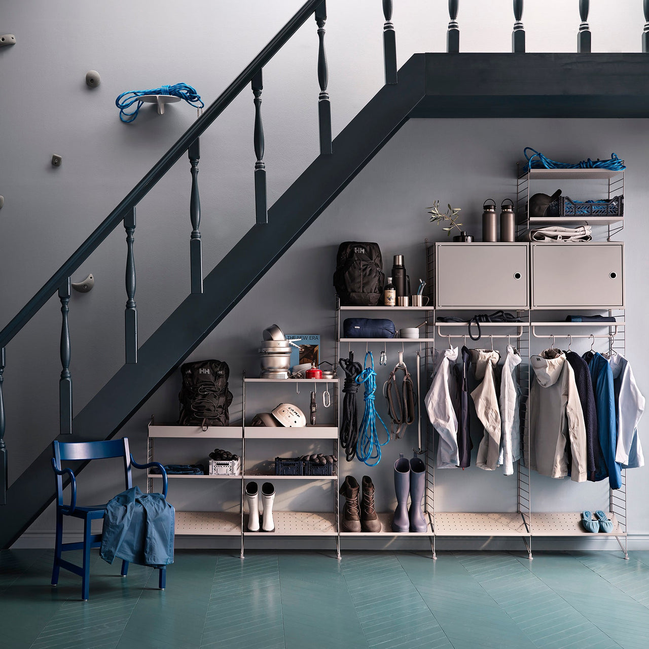 Available in a choice of 2 widths, String’s shelf for holding shoes keeps footwear securely in place with its slanted pitch. Made of fine-textured coated steel and offered in 4 color choices, it’s a useful addition to a bedroom or for closet storage. The add-on makes another fine example of the timeless versatility of Nils and Kajsa Strinning’s circa-1949 shelving system.