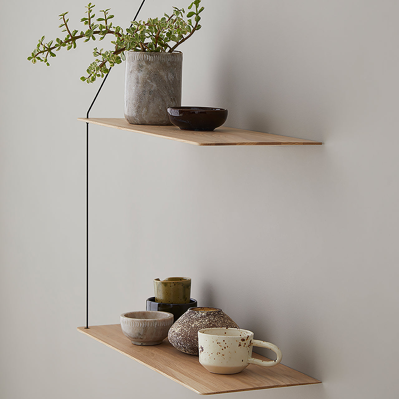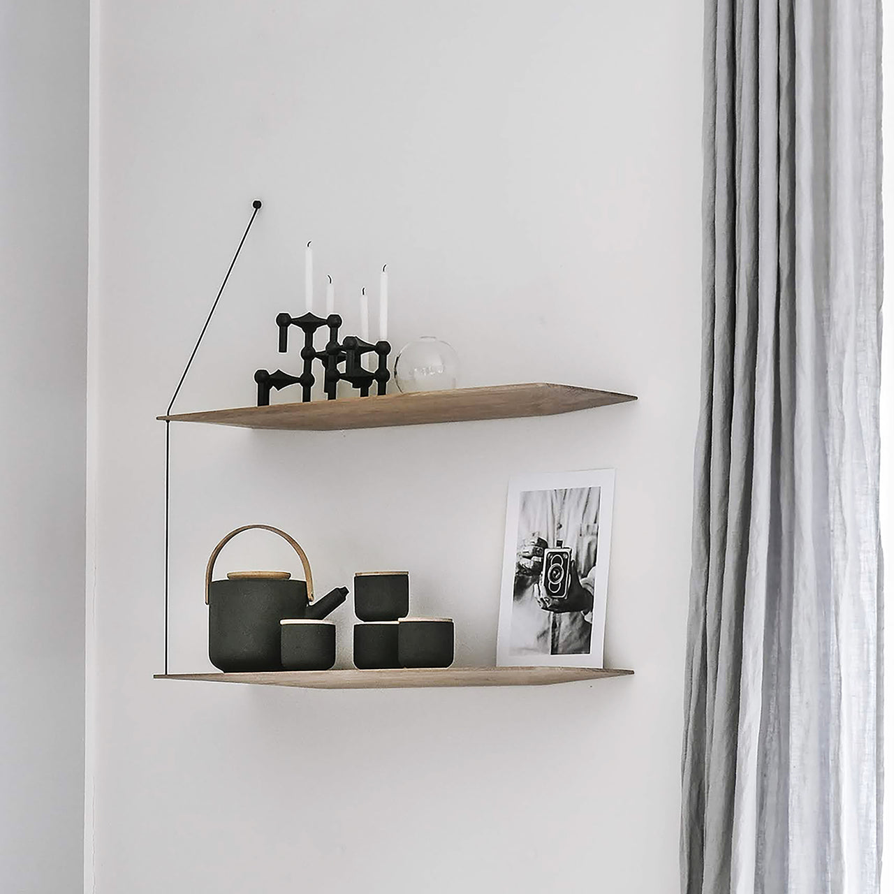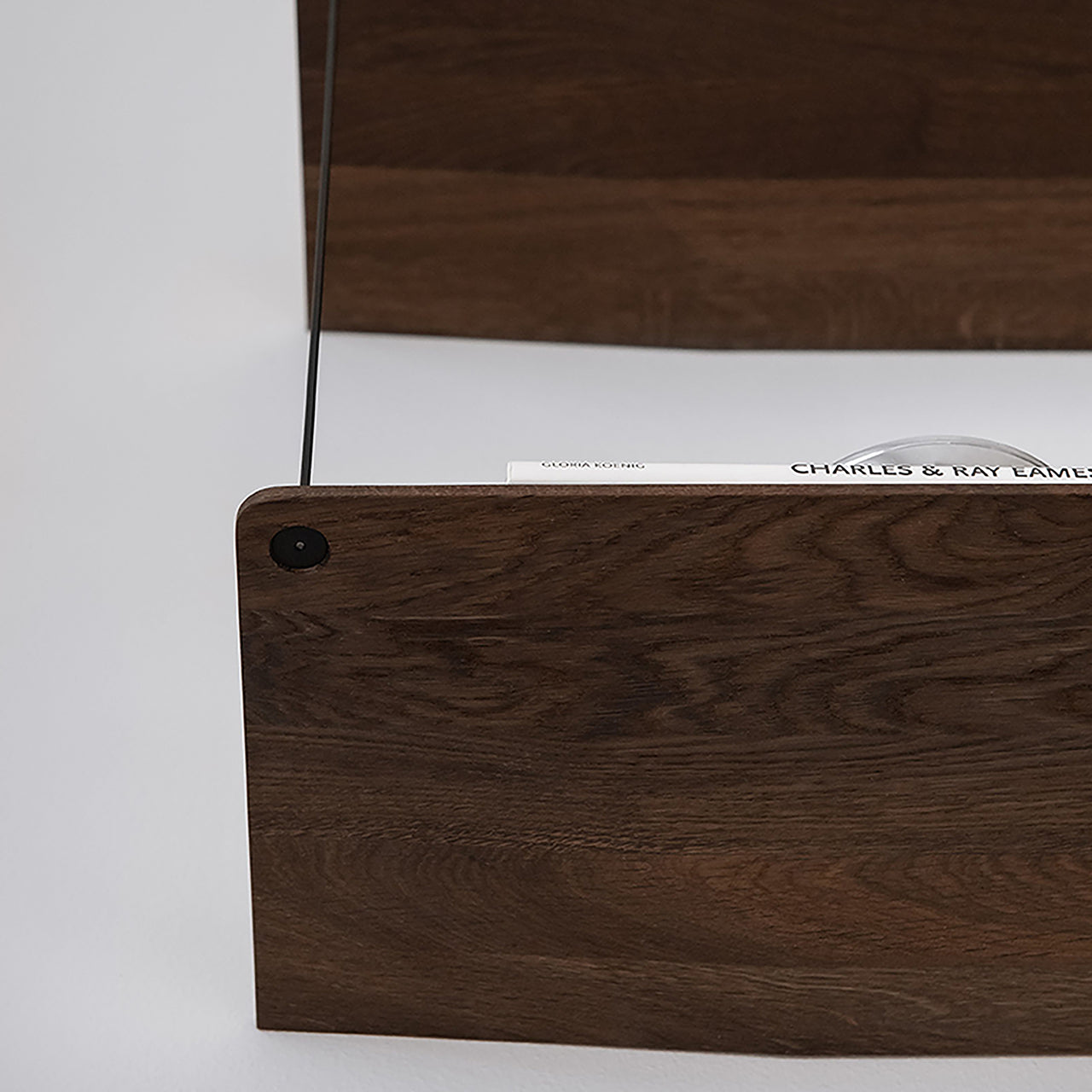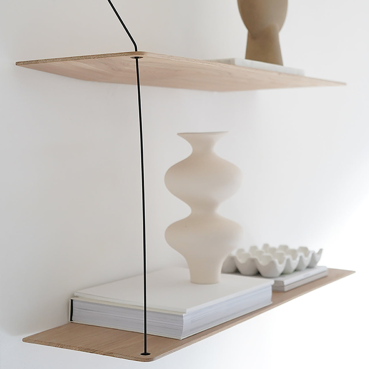 Like magic, Woud's Stedge shelving system appears to be held in place by a single cord. This minimalist sleight-of-hand from young German designer Leonard Aldenhoff reveals itself as shelves attached to a wall with screws and connecting metal wires. Light and airy in concept, Stedge comes with 2 slim oak shelves and can be extended with extra shelves purchased separately