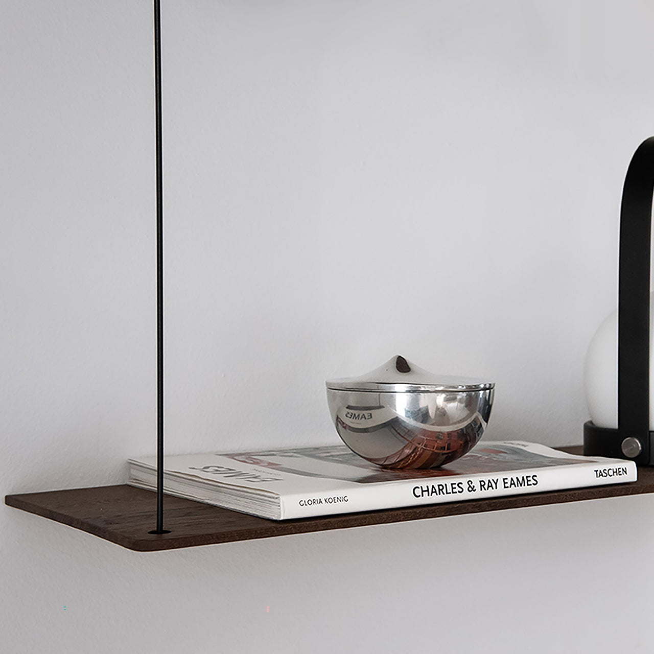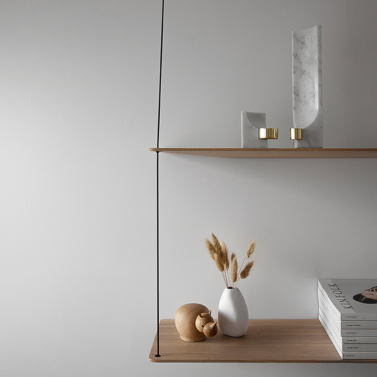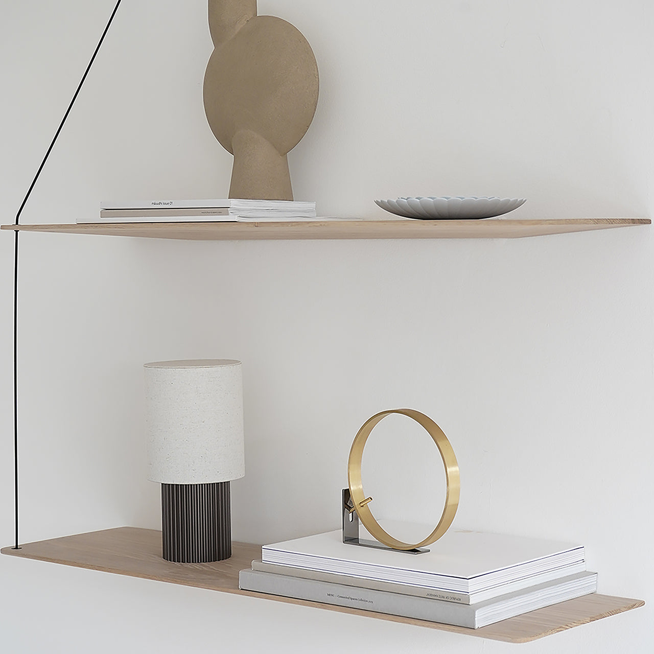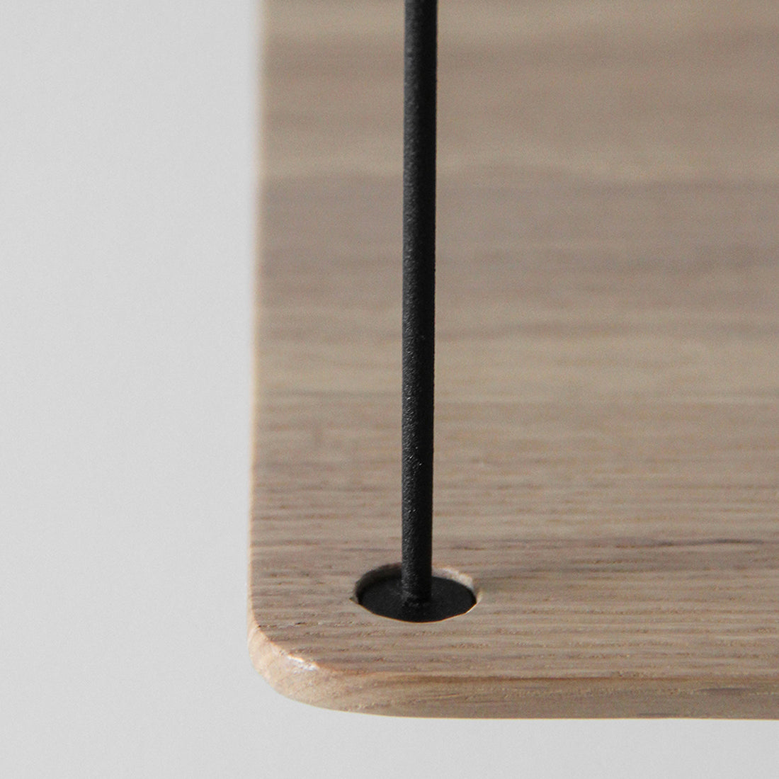 Like magic, Woud's Stedge shelving system appears to be held in place by a single cord. This minimalist sleight-of-hand from young German designer Leonard Aldenhoff reveals itself as shelves attached to a wall with screws and connecting metal wires. Light and airy in concept, Stedge comes with 2 slim oak shelves and can be extended with extra shelves purchased separately