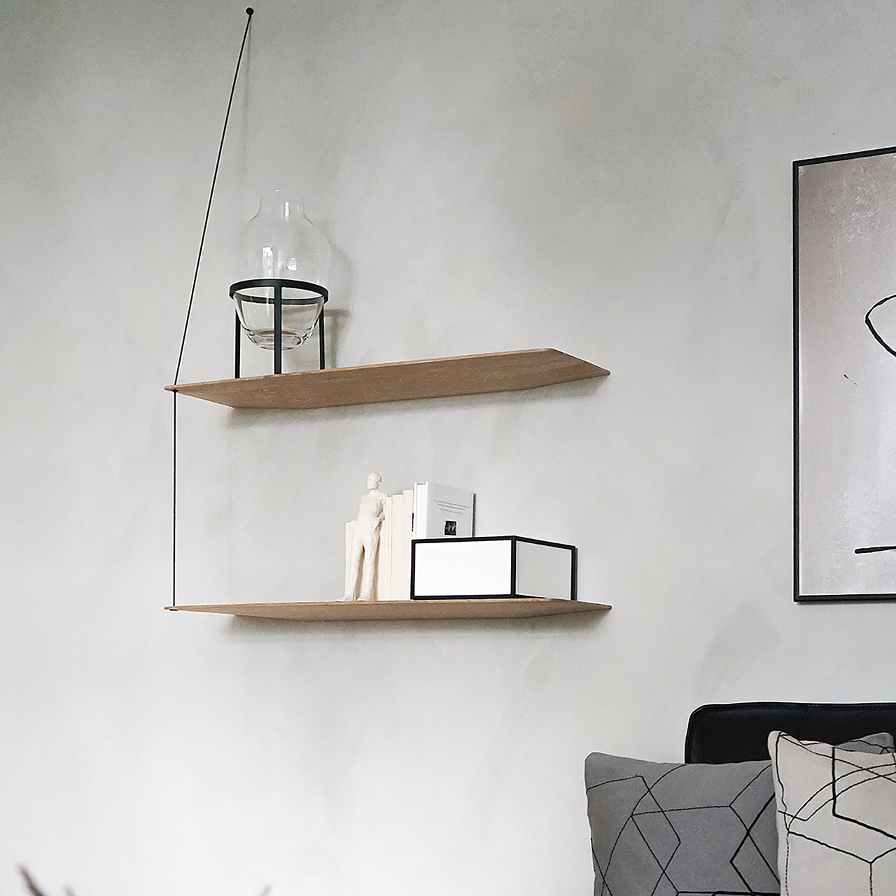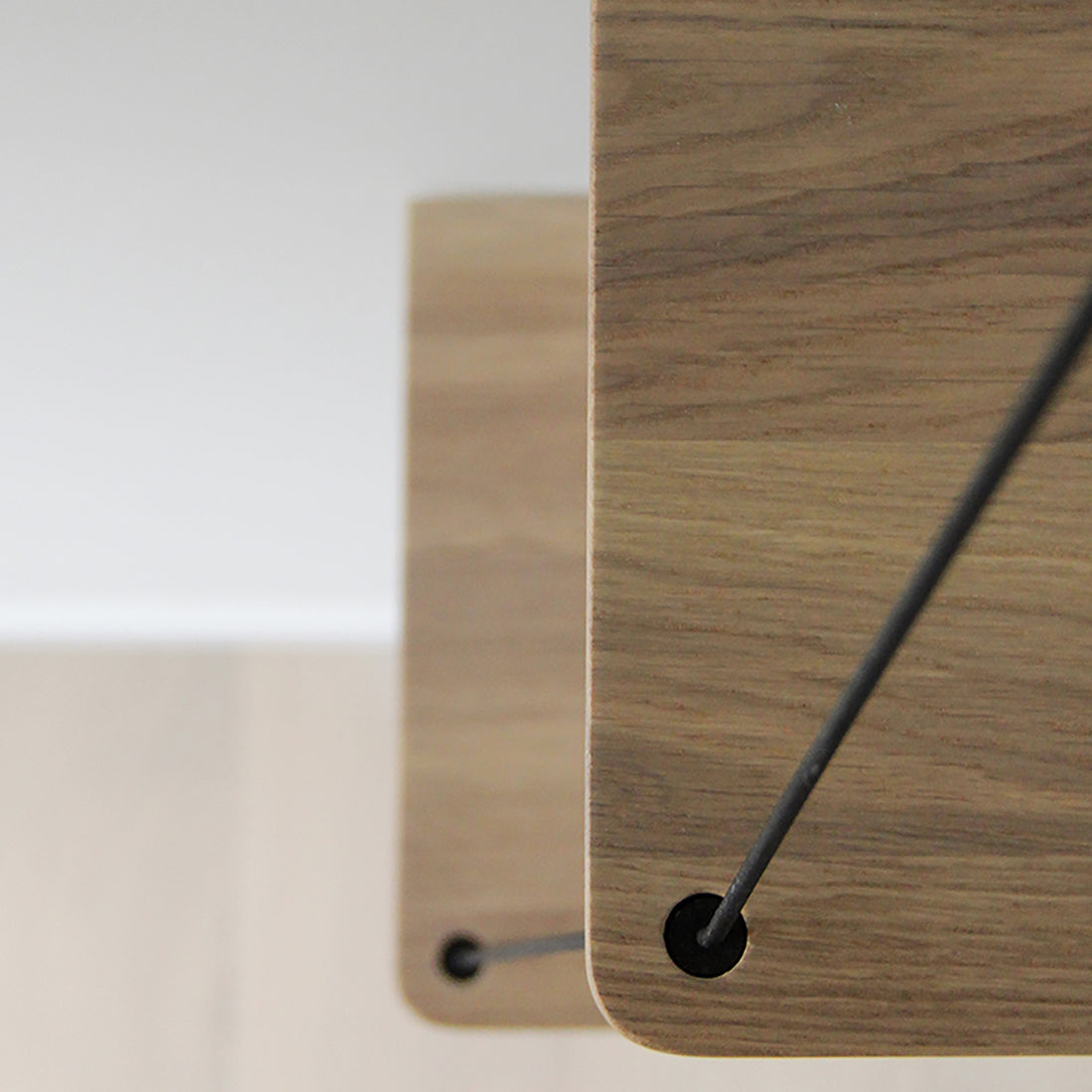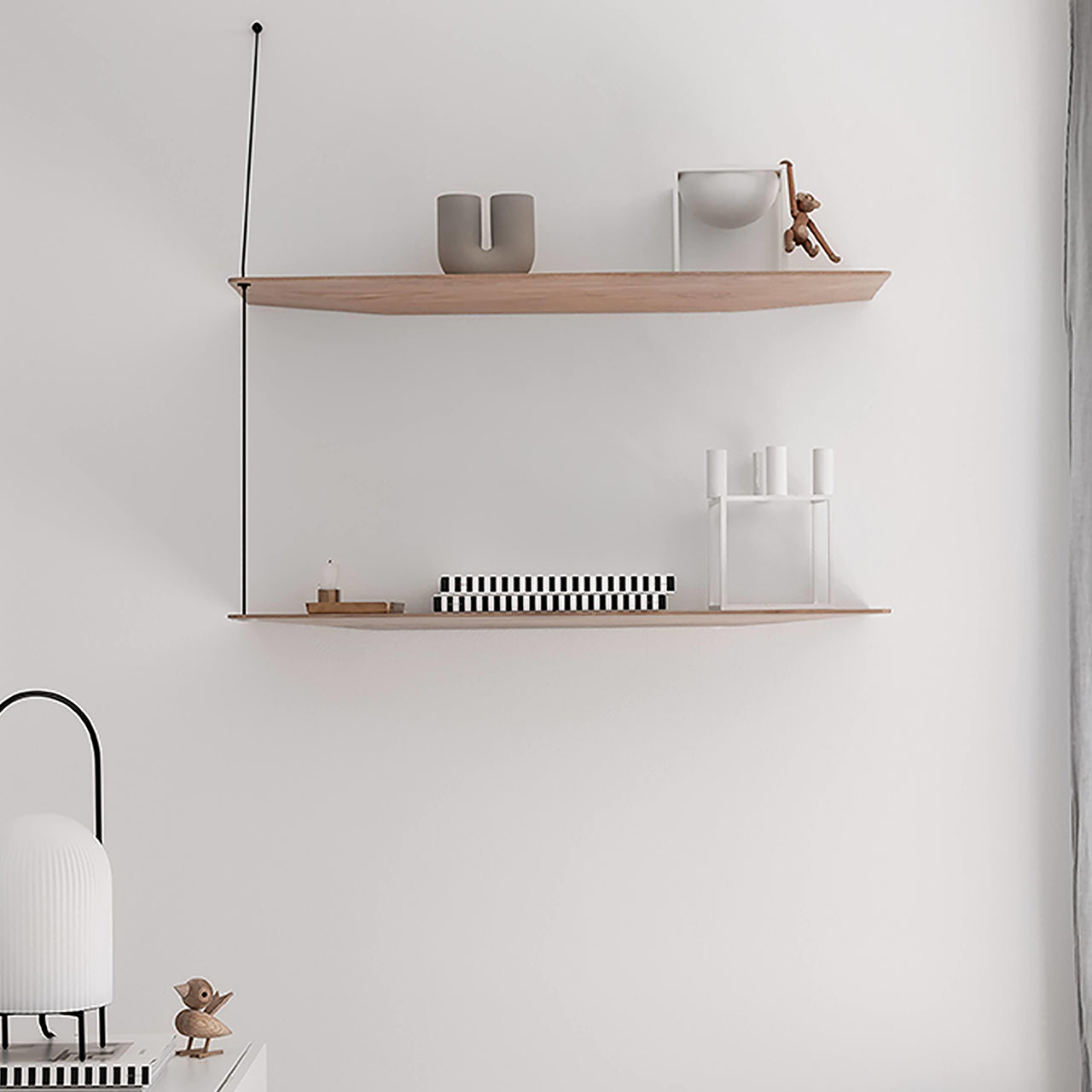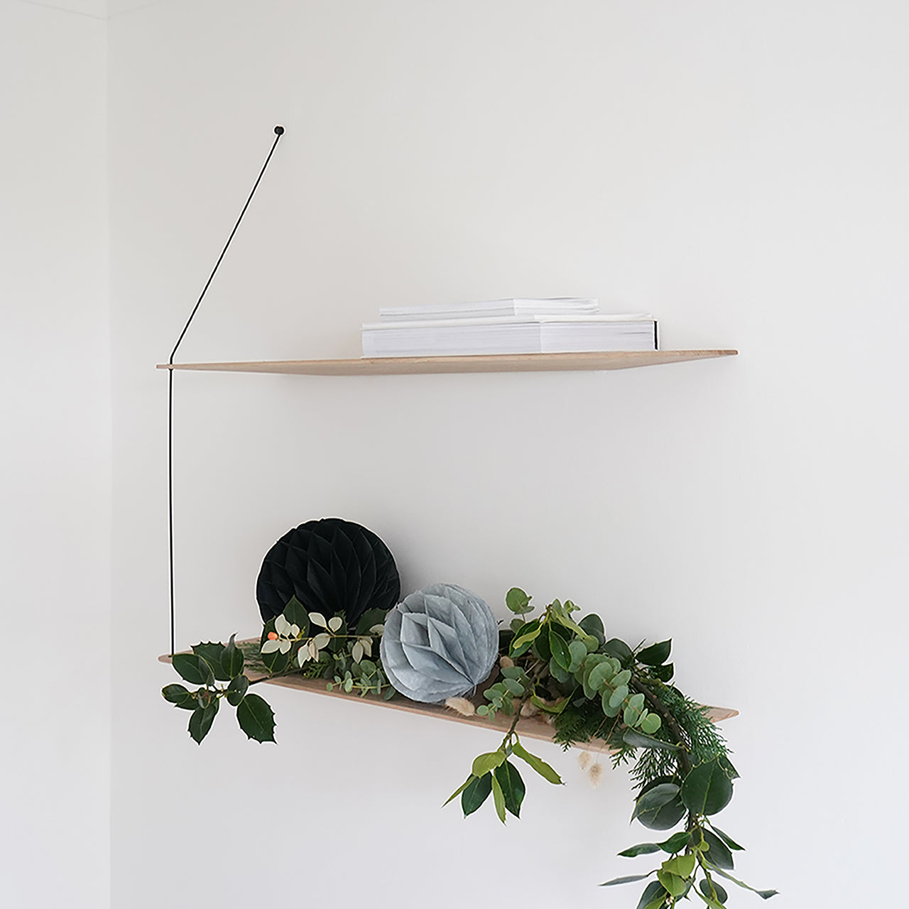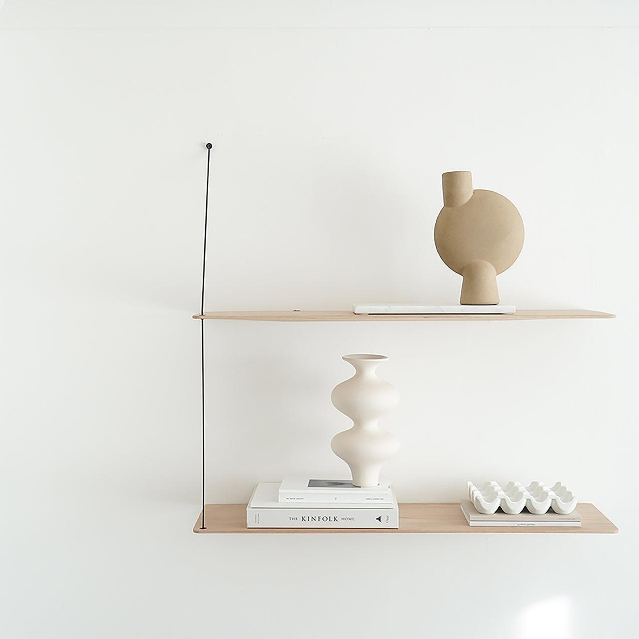 Like magic, Woud's Stedge shelving system appears to be held in place by a single cord. This minimalist sleight-of-hand from young German designer Leonard Aldenhoff reveals itself as shelves attached to a wall with screws and connecting metal wires. Light and airy in concept, Stedge comes with 2 slim oak shelves and can be extended with extra shelves purchased separately