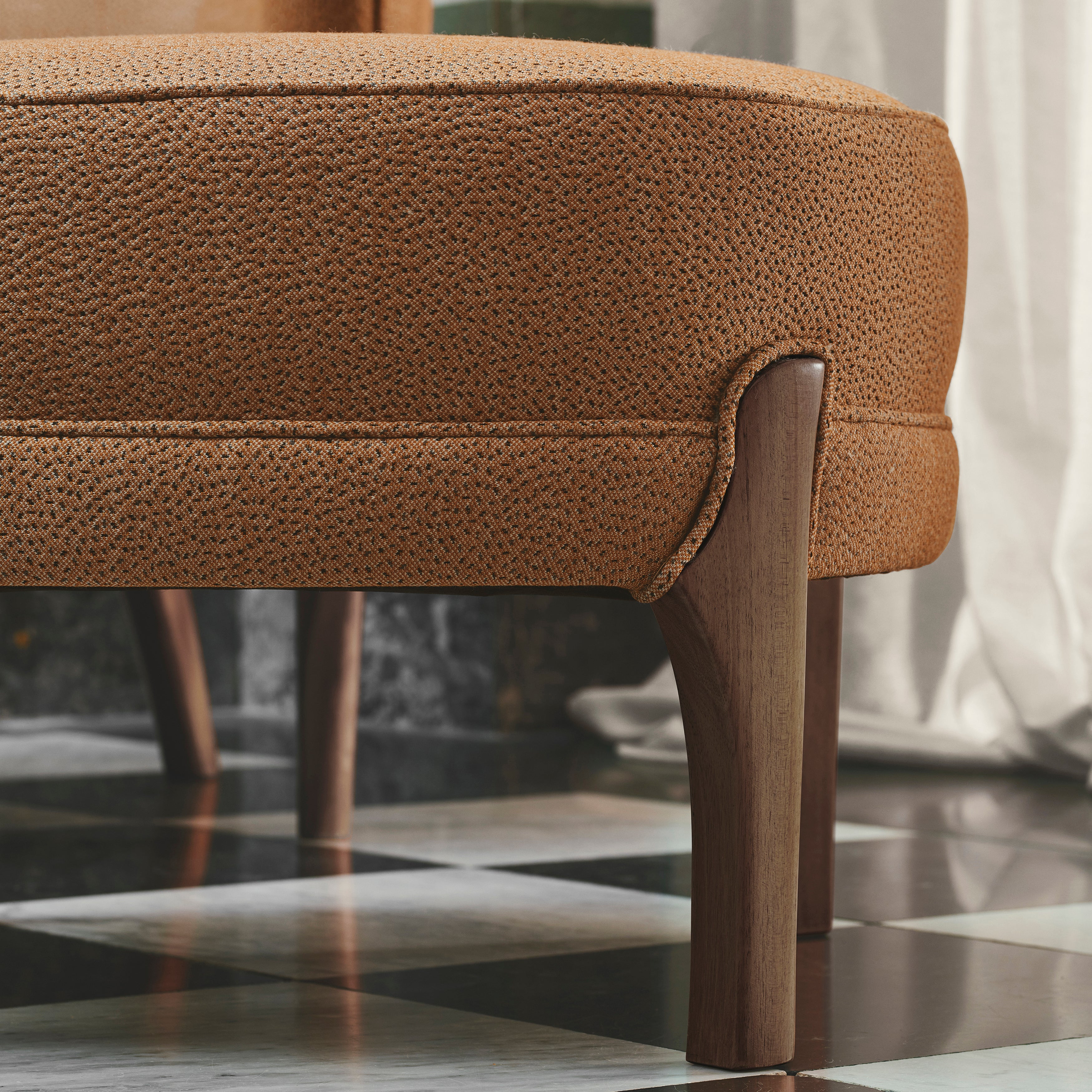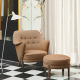 The Cocktail Pouf, designed by Arne Hovmand-Olsen, complements the classic Cocktail Lounge Chair. Upholstered in soft, high-quality fabric or sheepskin, the pouf rests on a wooden base available in 3 oak finishes, adding a natural warmth to its design. Compact yet inviting, it serves both as a footrest and an independent seating option.