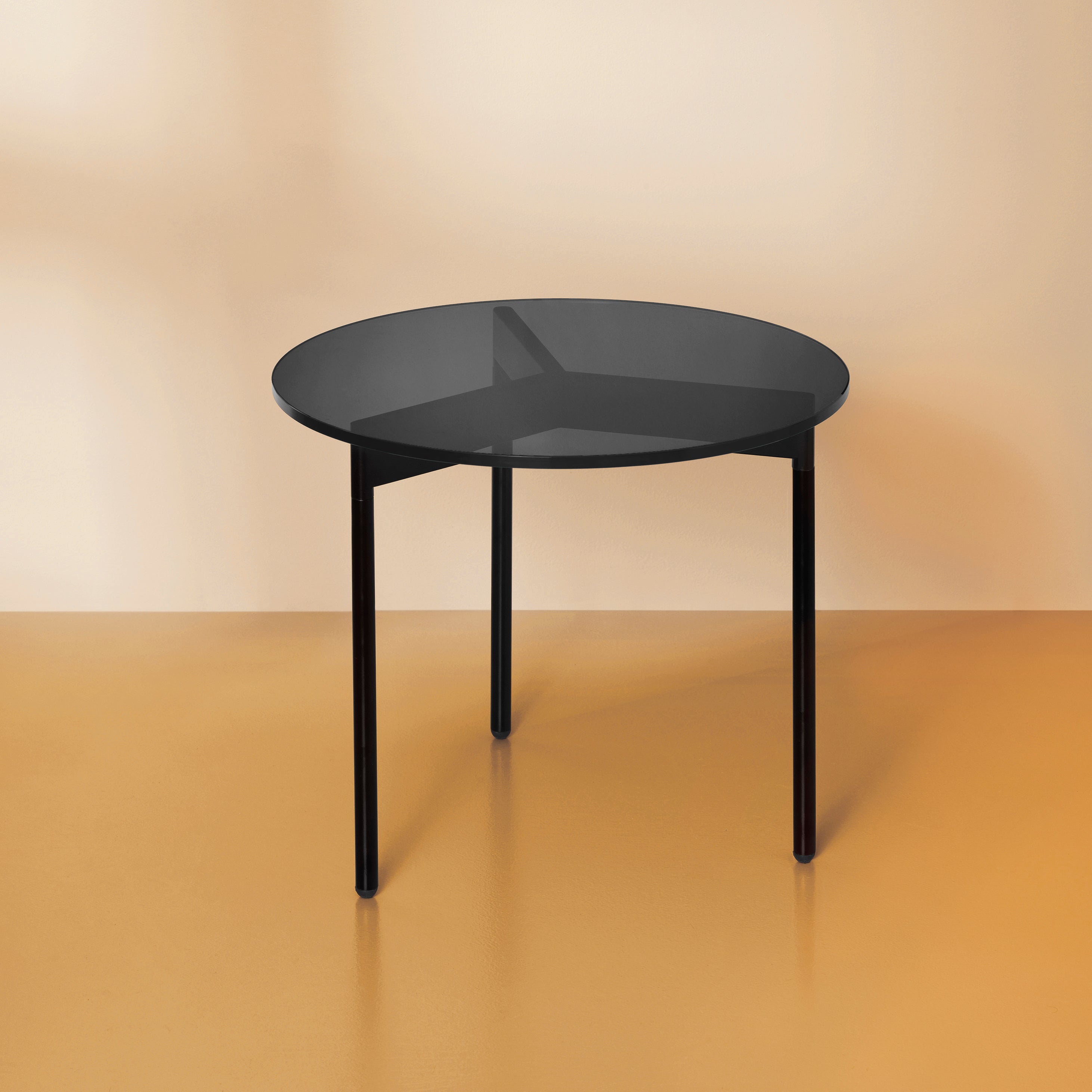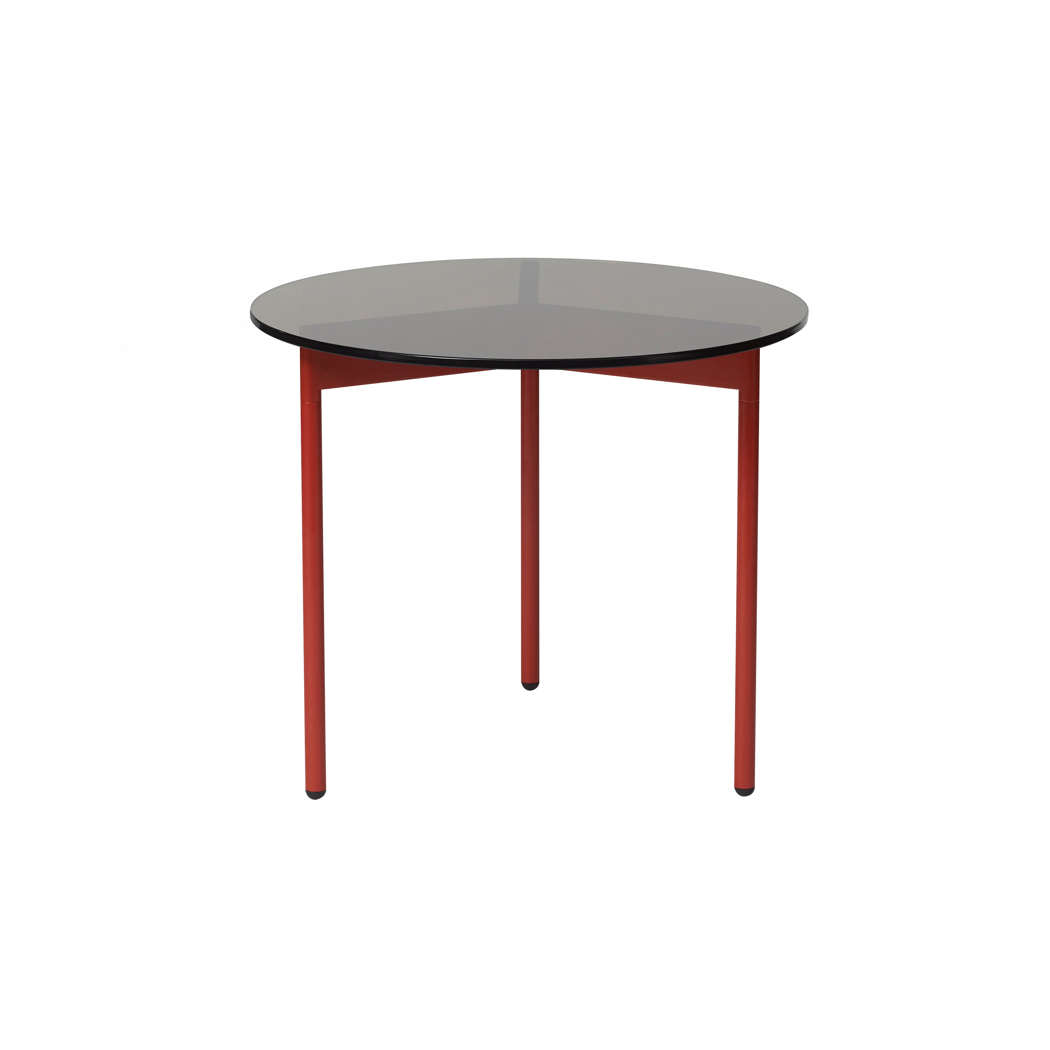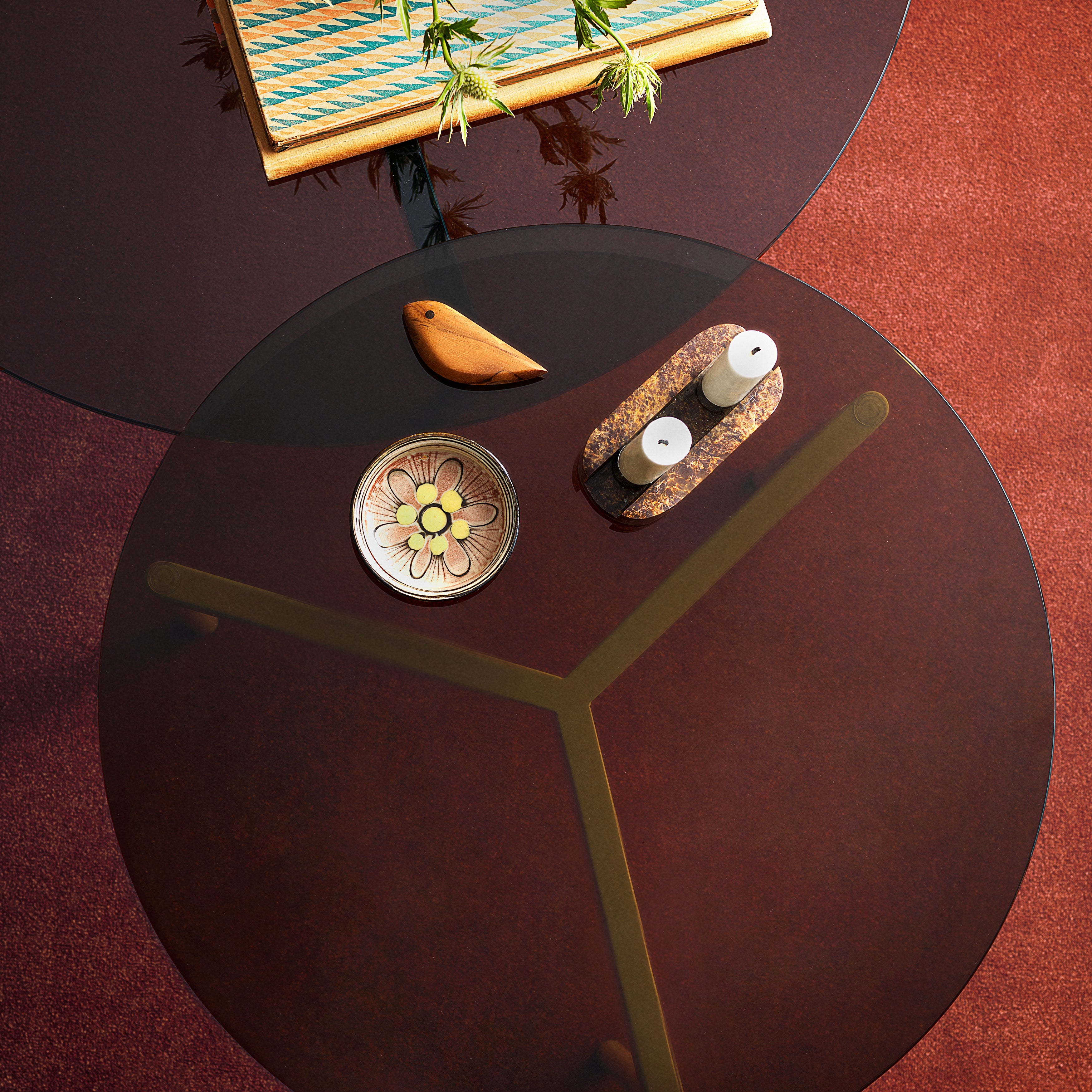 A transparent glass round tops From Above, highlighting the graphic simplicity of the coffee table’s triangulated steel base and making a bold statement from designers Morten & Jonas. Choose between 2 different sizes, with the frame in warm white or select Warm Nordic colors, and the option of either clear glass or smoky variants.