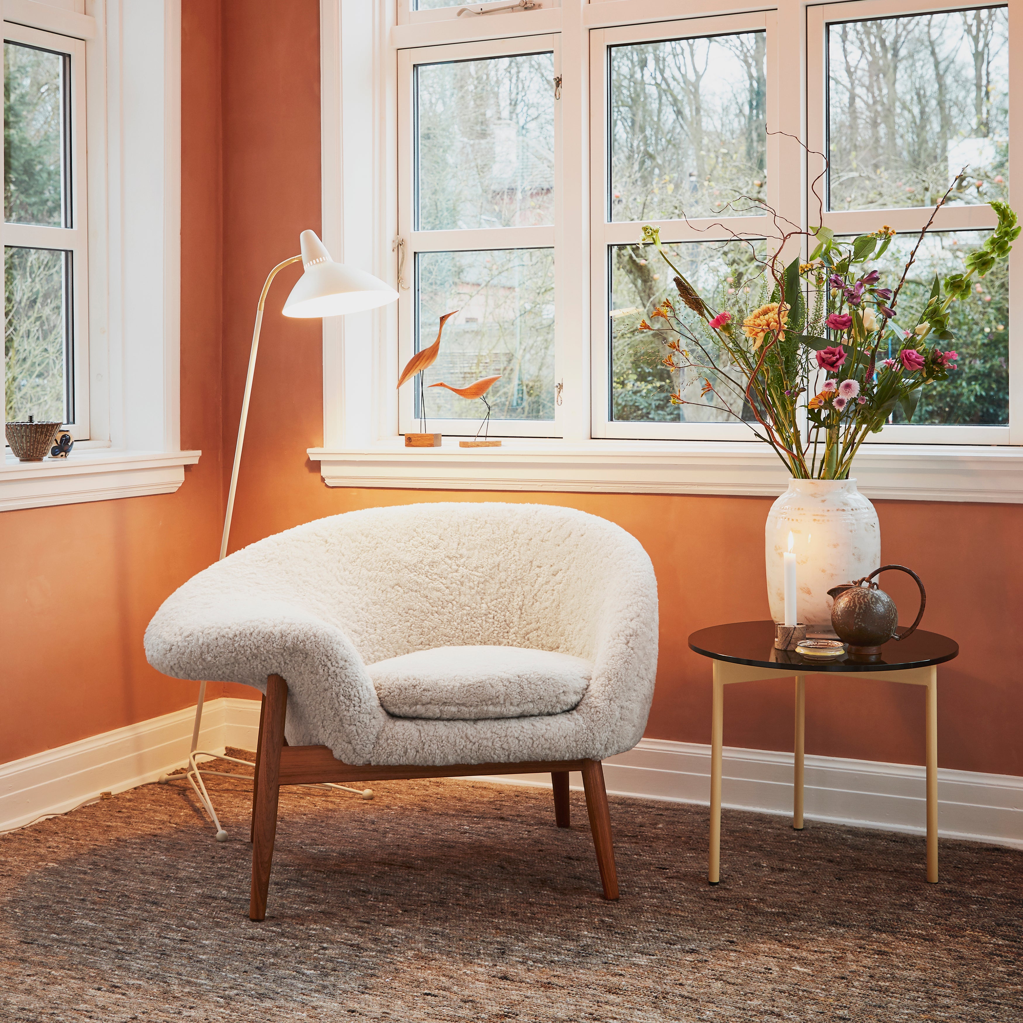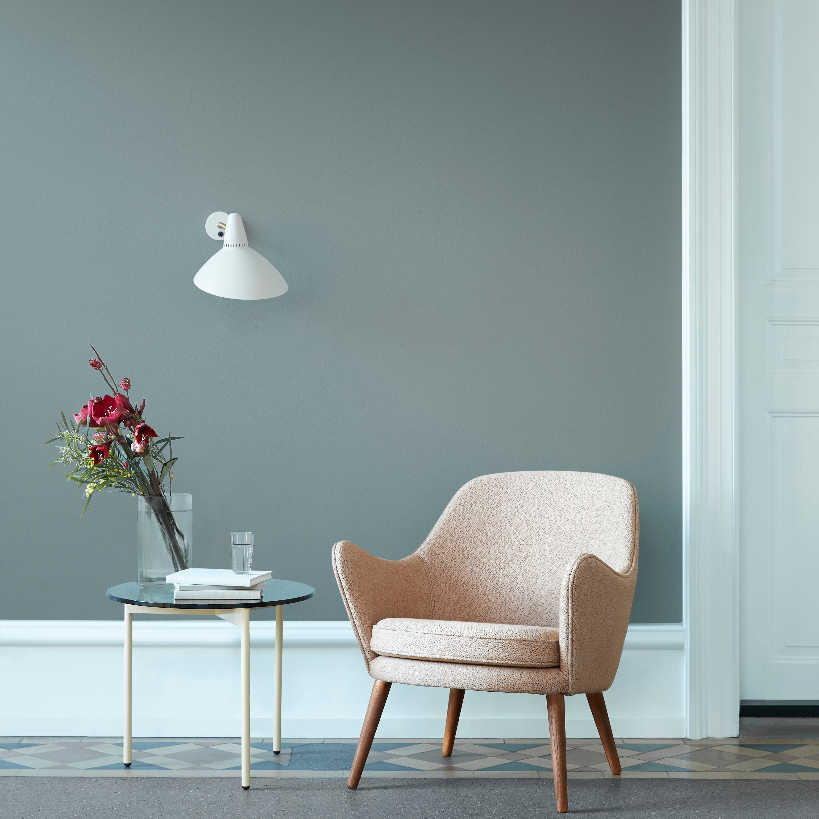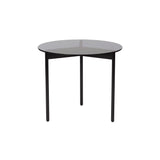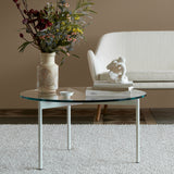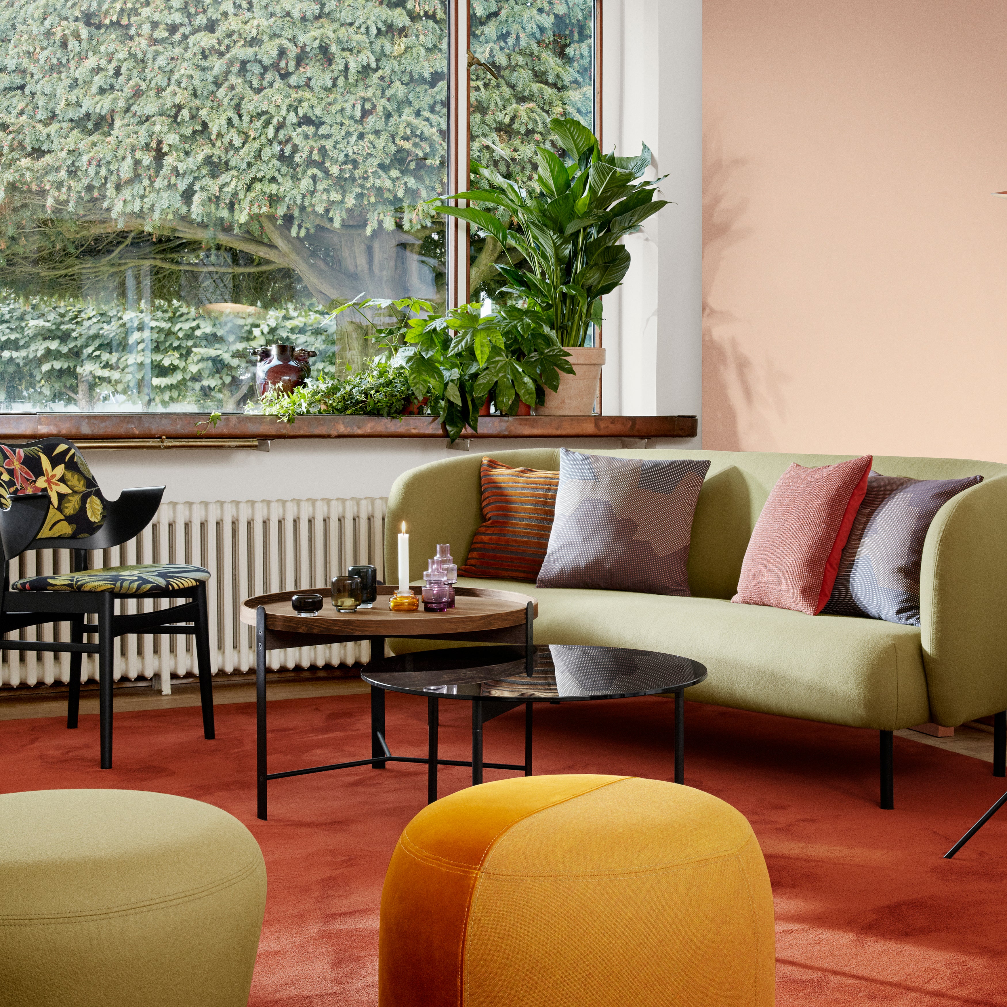 A transparent glass round tops From Above, highlighting the graphic simplicity of the coffee table’s triangulated steel base and making a bold statement from designers Morten & Jonas. Choose between 2 different sizes, with the frame in warm white or select Warm Nordic colors, and the option of either clear glass or smoky variants.