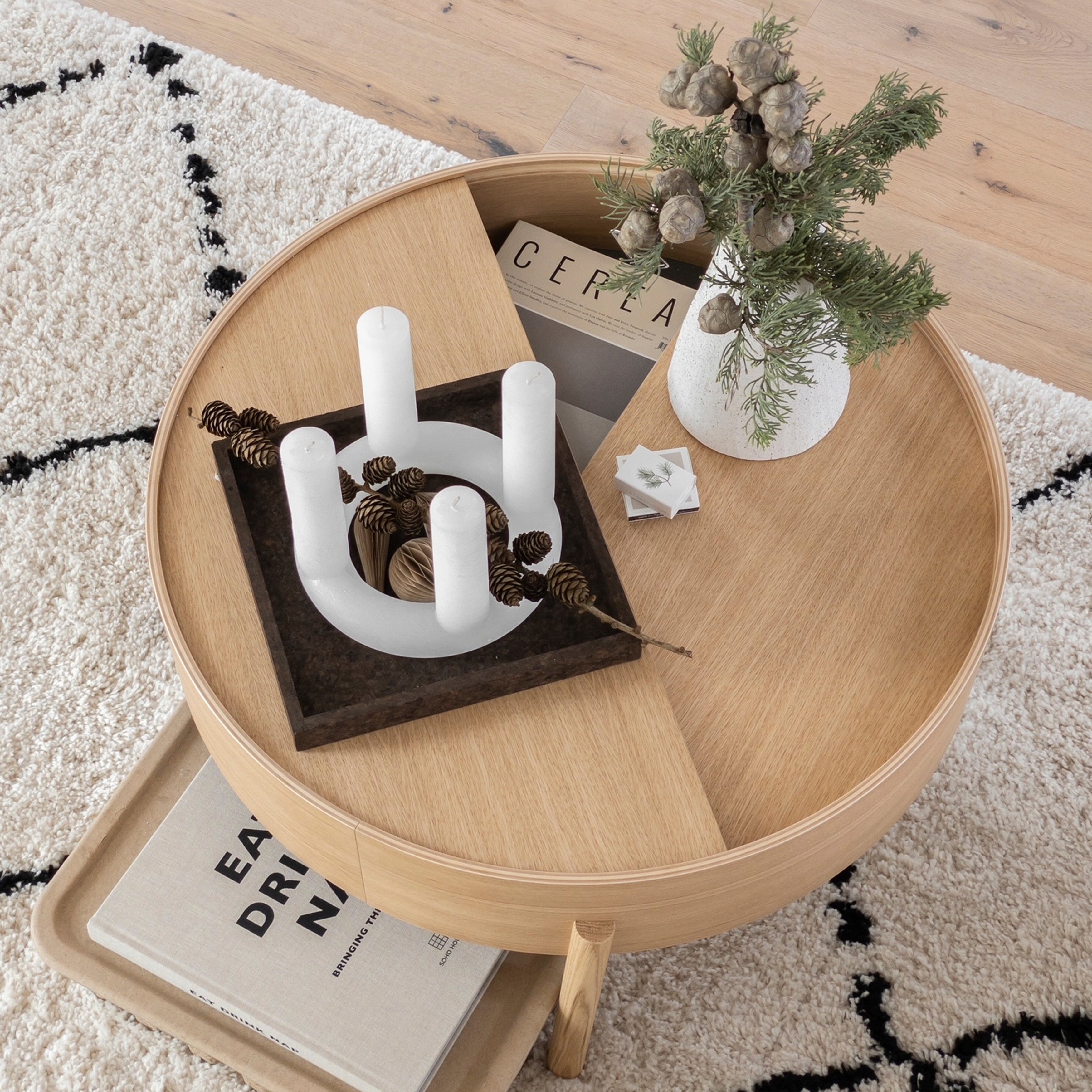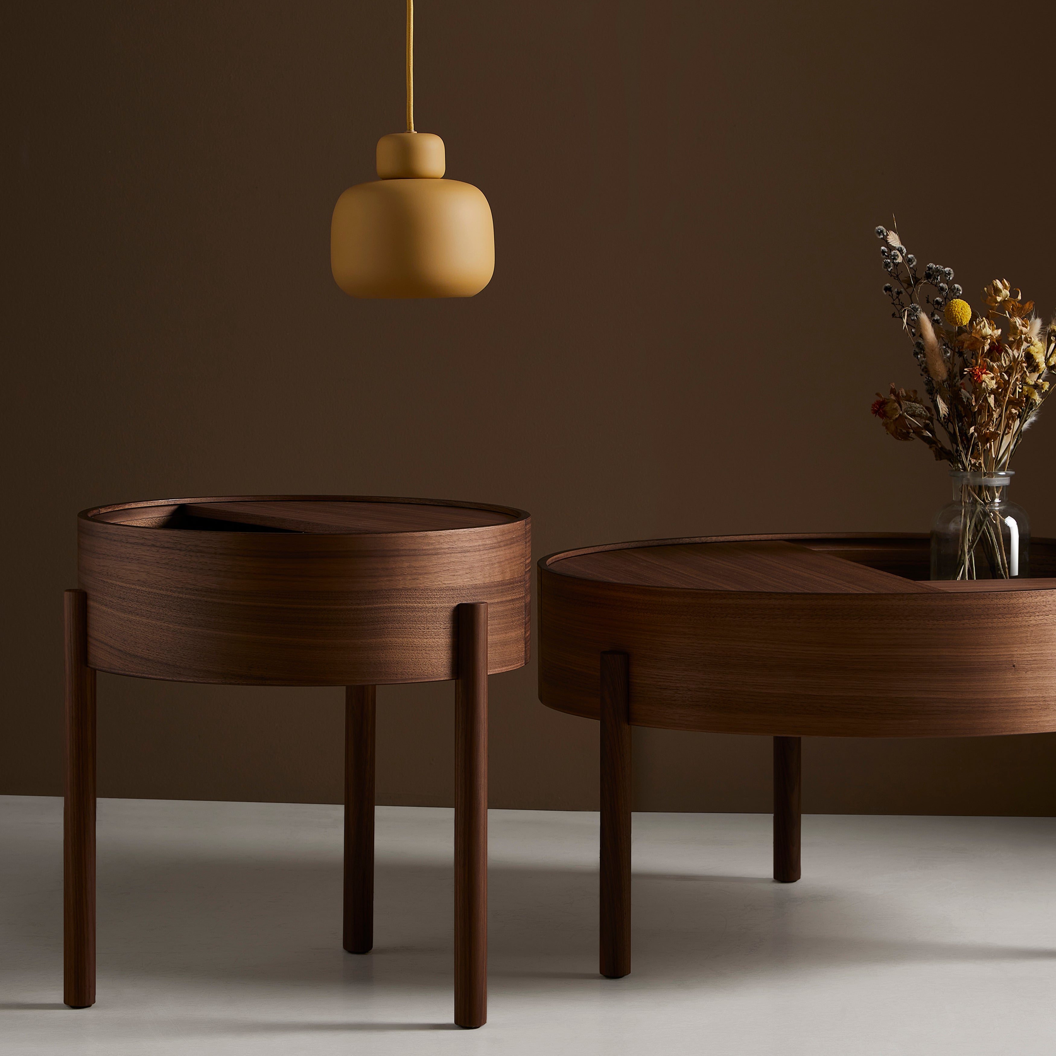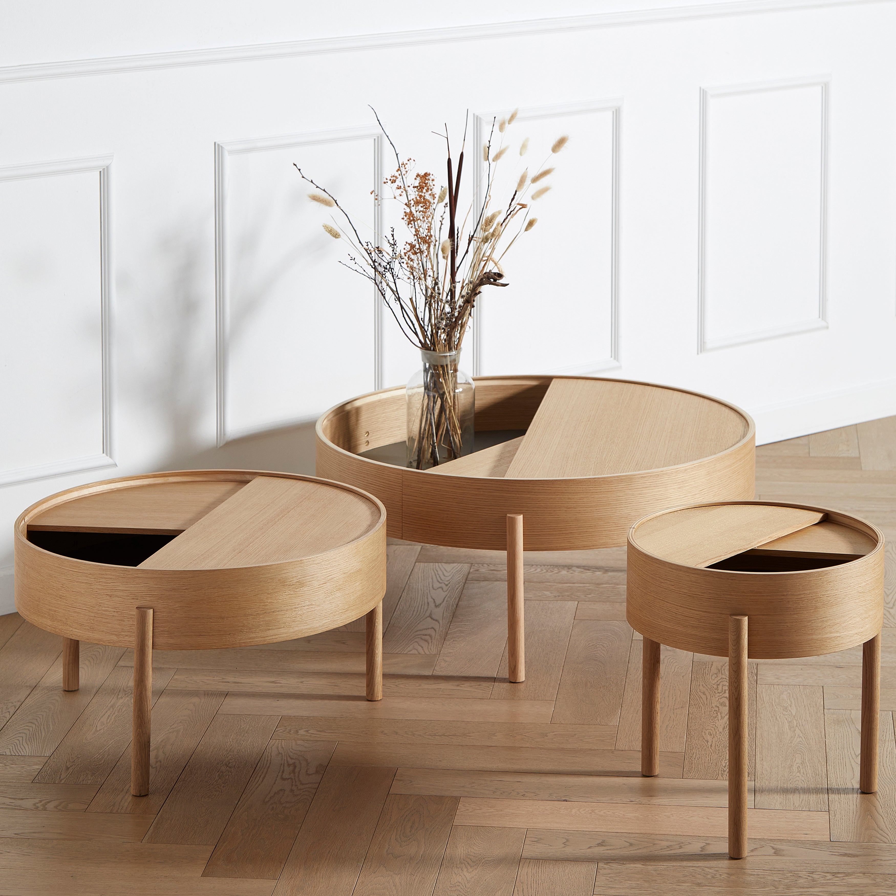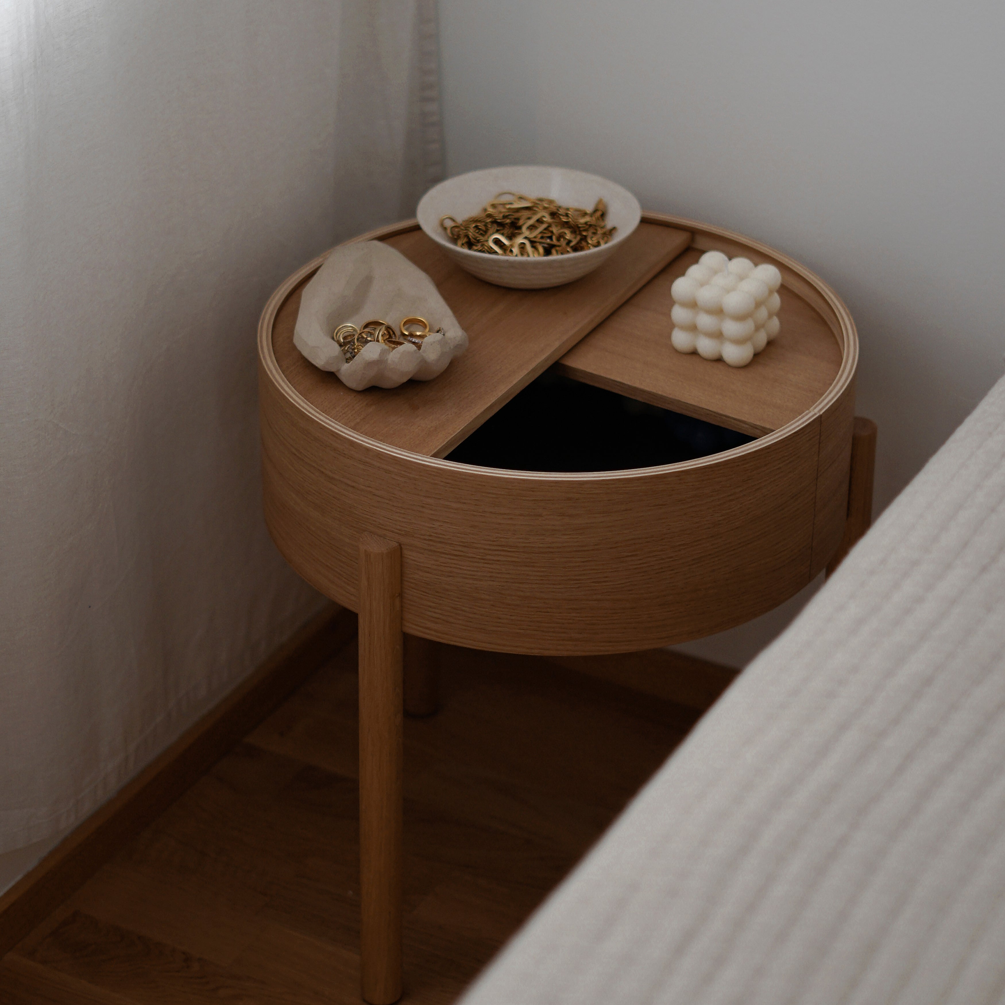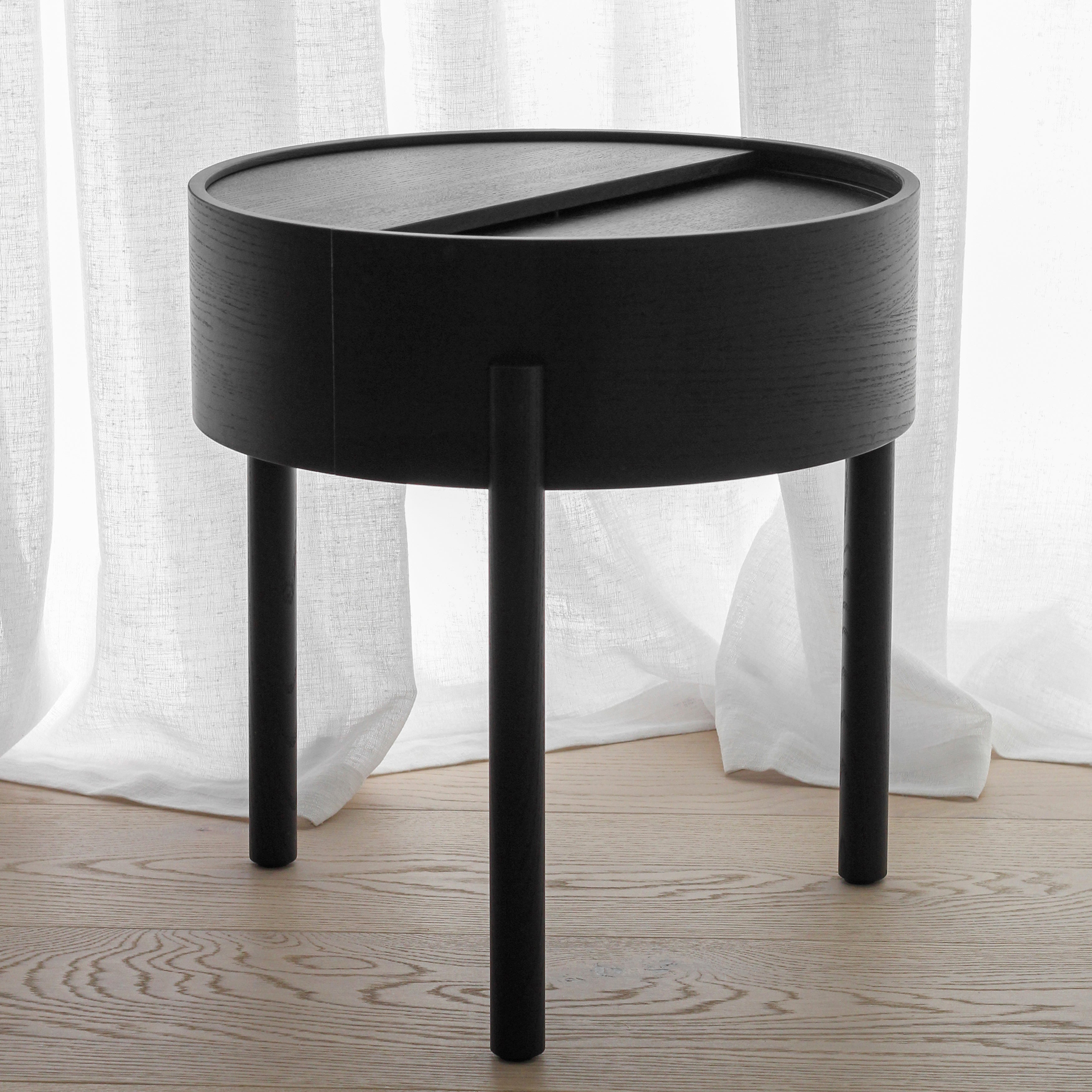 Designers Julie Begtrup and Ditte Vad wanted to create a stylish side table with a little something extra. Arc’s name alludes to the circular tabletop with a rotating section that reveals a hidden storage compartment. The inside surface is covered with a smooth nanolaminate to complement the ash wood and the 3-legged conceit adds a playful note.