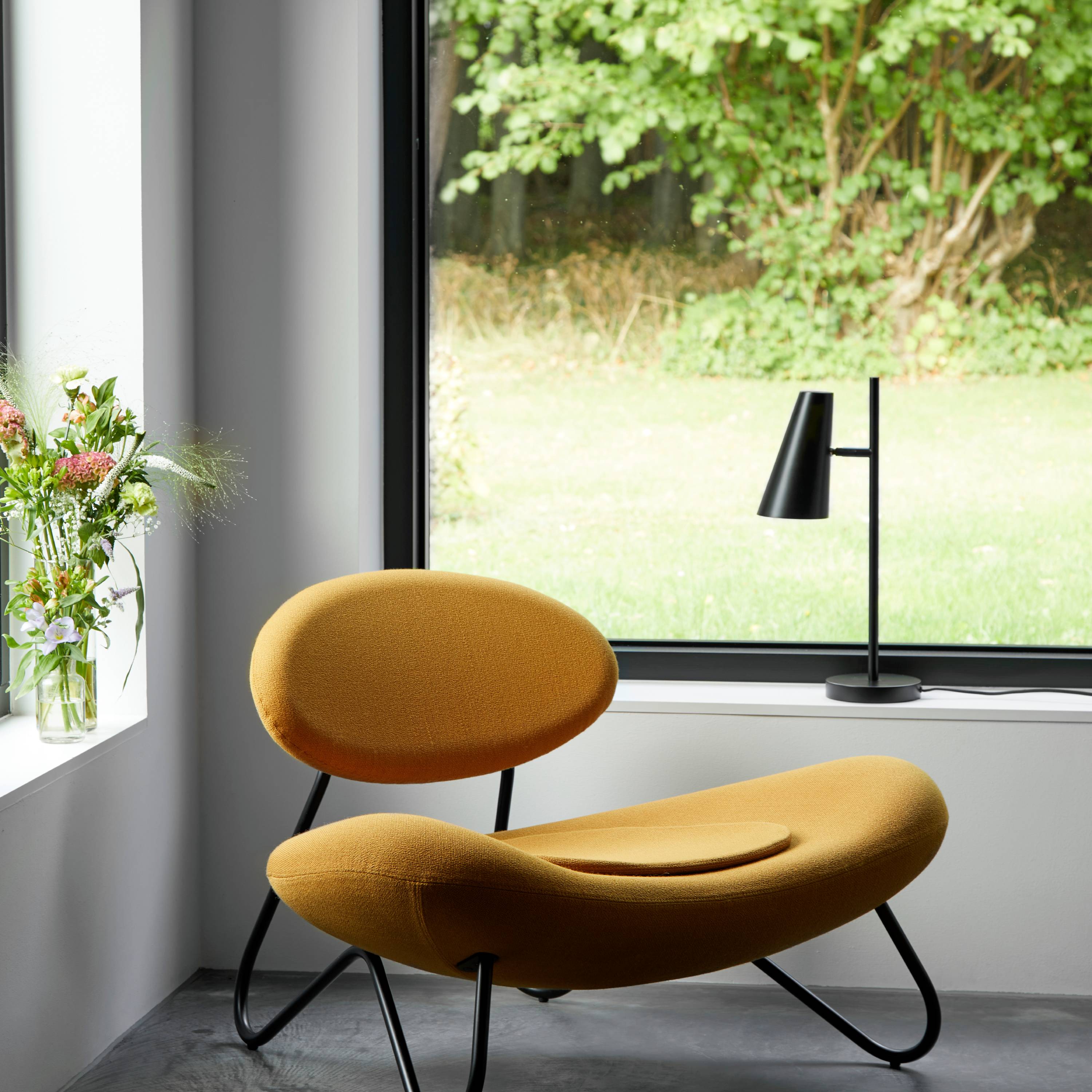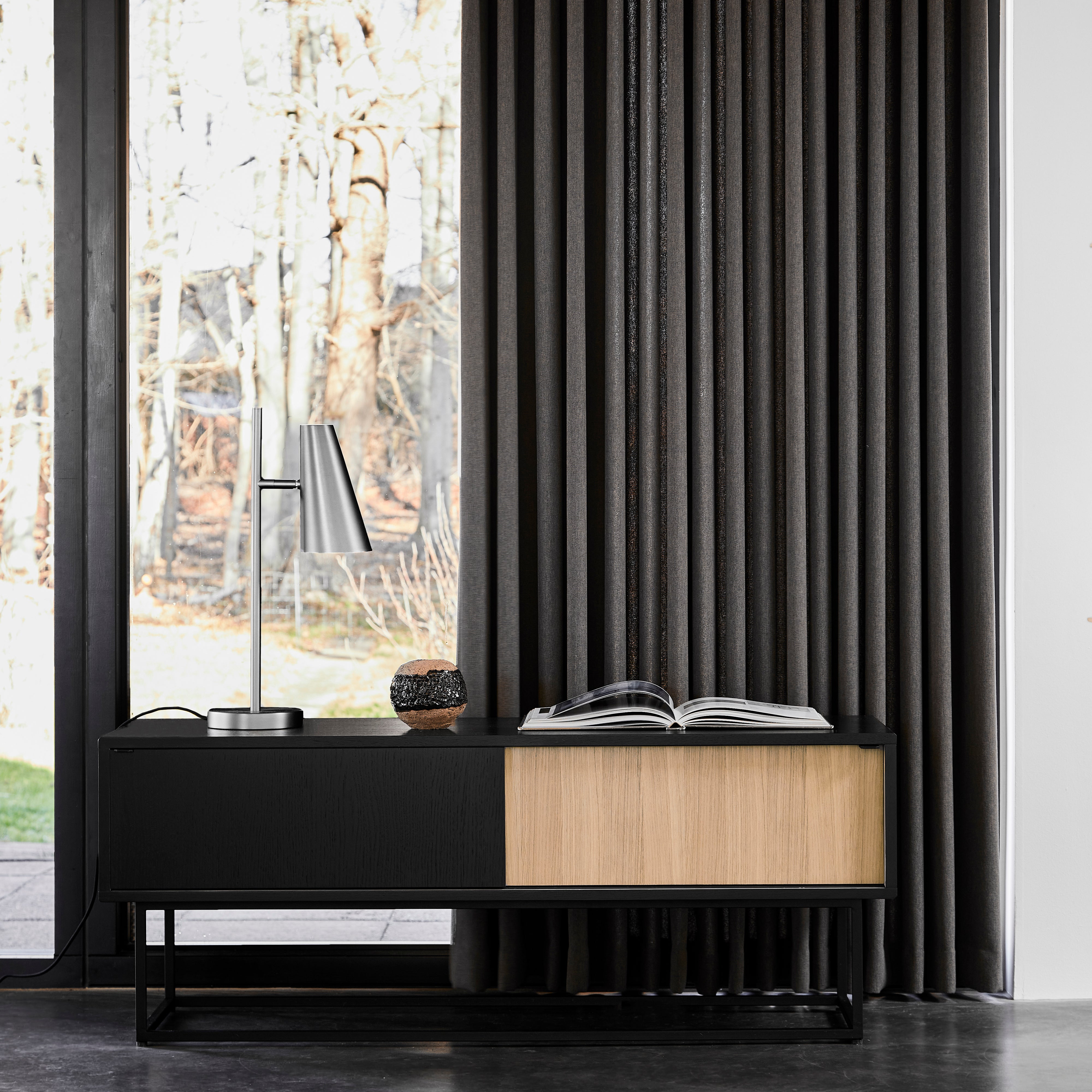 An articulated lampshade offers functional lighting that complements Cono’s timeless modernist style. As a task lamp on the desk, a reading light or next to the bed, it can be adjusted to aim the light exactly where it is desired. In matte-black painted metal, the striking design comes from a collaboration between 2 Danish icons, lighting designer and manufacturer Benny Frandsen and modernist brand Woud, with the lamp’s name taken from “conoid,” the mathematical term for cone.