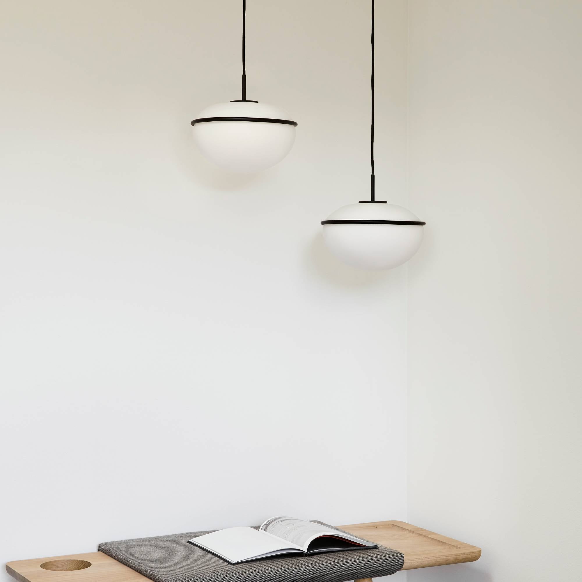 It's quietly ironic that Woud's floating pendant would be a sister light to a table model originally inspired by hot air balloons. Pump's hovering structure certainly seems fit to be airborne, with a puffed-up opal glass shade banded with black-painted metal. And it's a prime reflection of its Spanish designer, Jordi López Aguiló of Kutarq Studio, who takes both a playful and useful stance to turn out objects with a winning hint of personality.