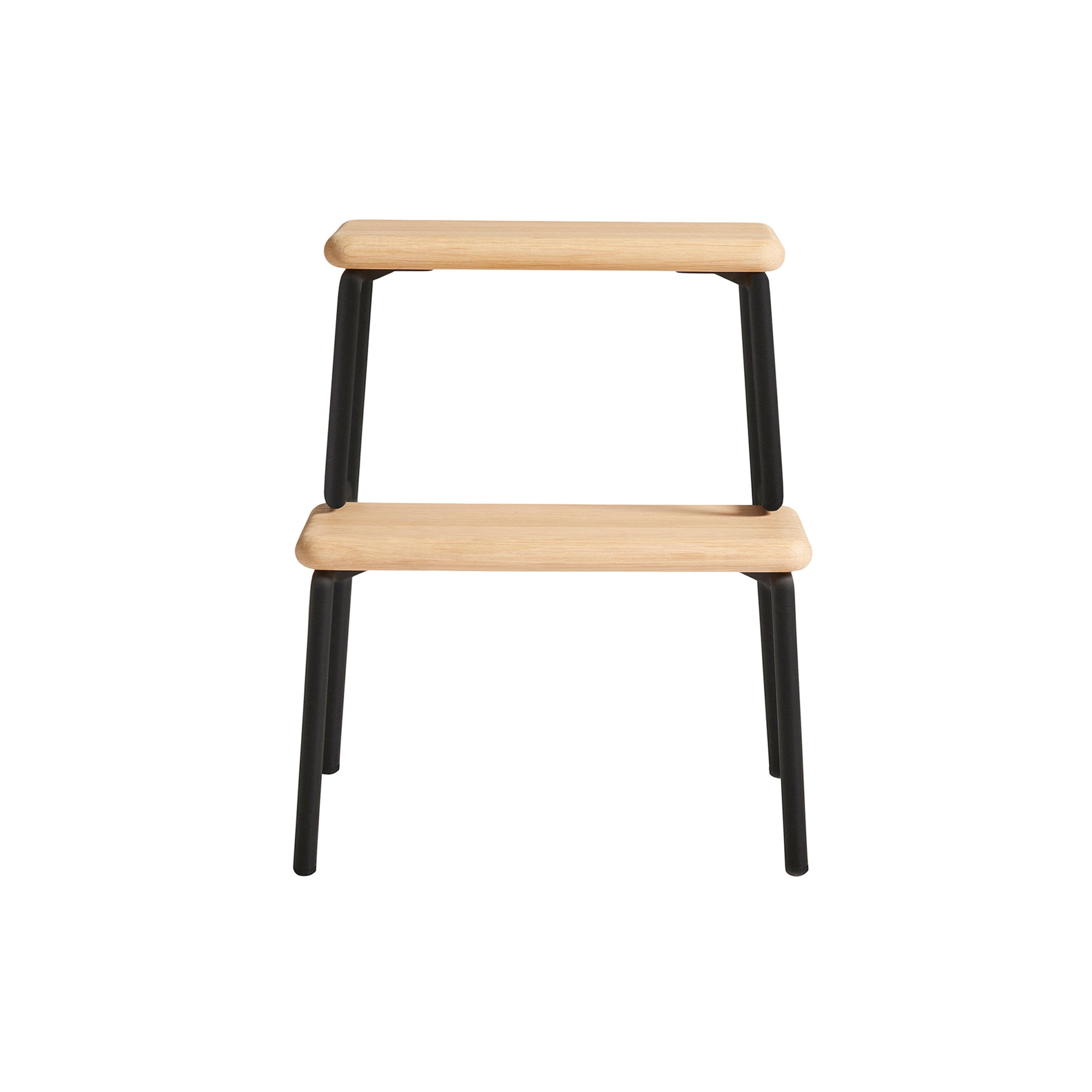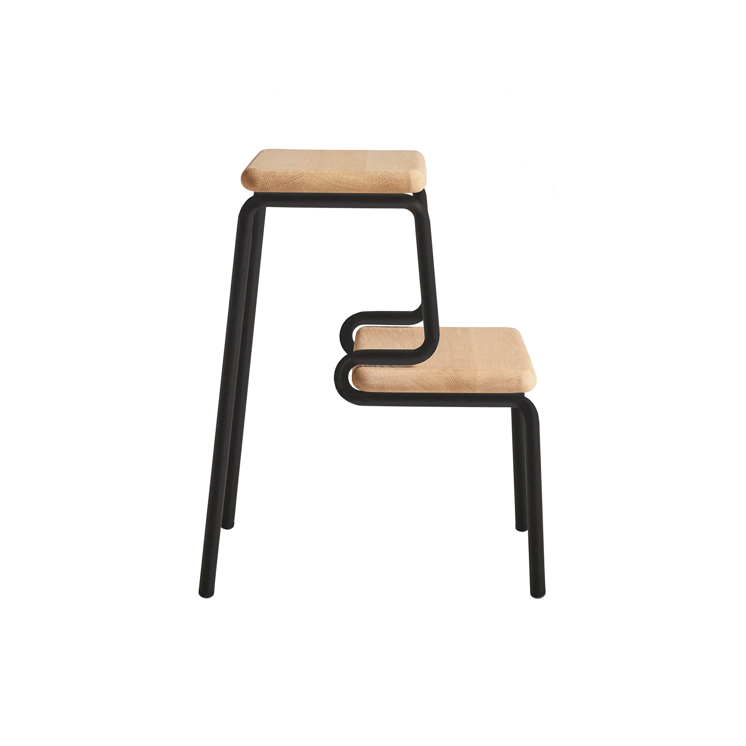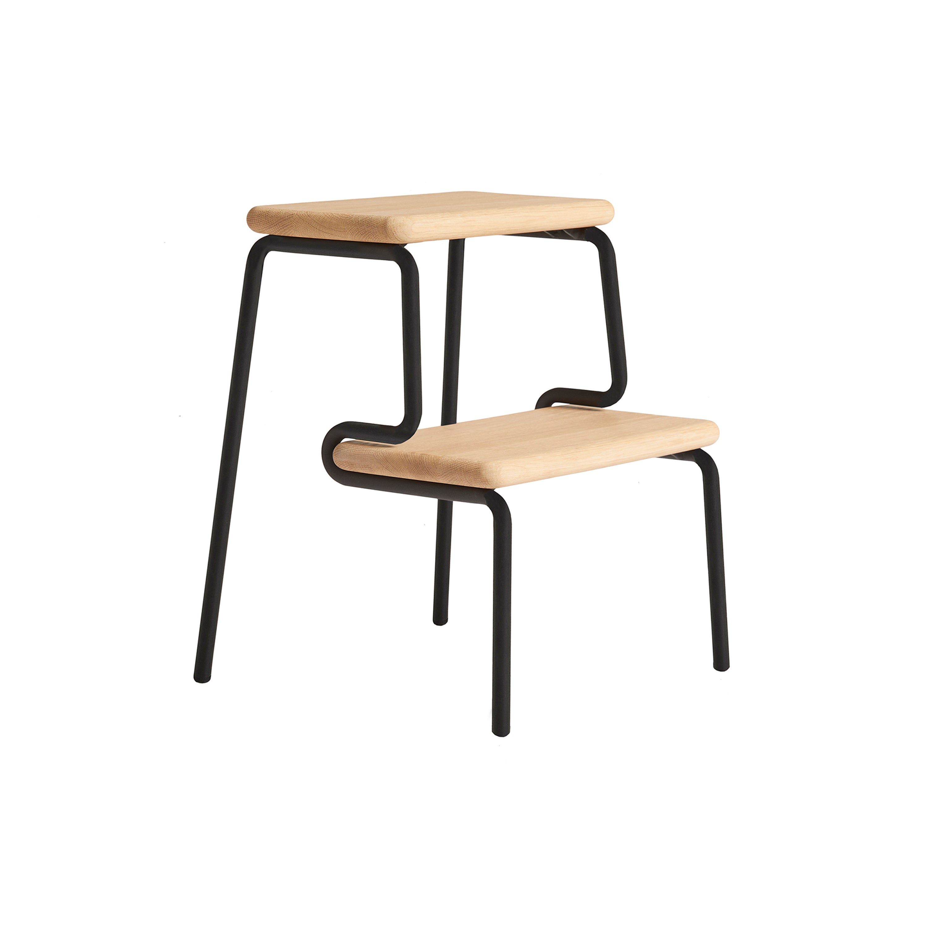 With a graphic silhouette echoing a downhill run carved into the snow, Stockholm-based designer Qian Jiang conceives a versatile step stool in white-pigmented solid oak with a black painted frame. Slalom serves as an easy assist for reaching top shelves in the closet, a seat for a little one children or a convenient side table by the bed.