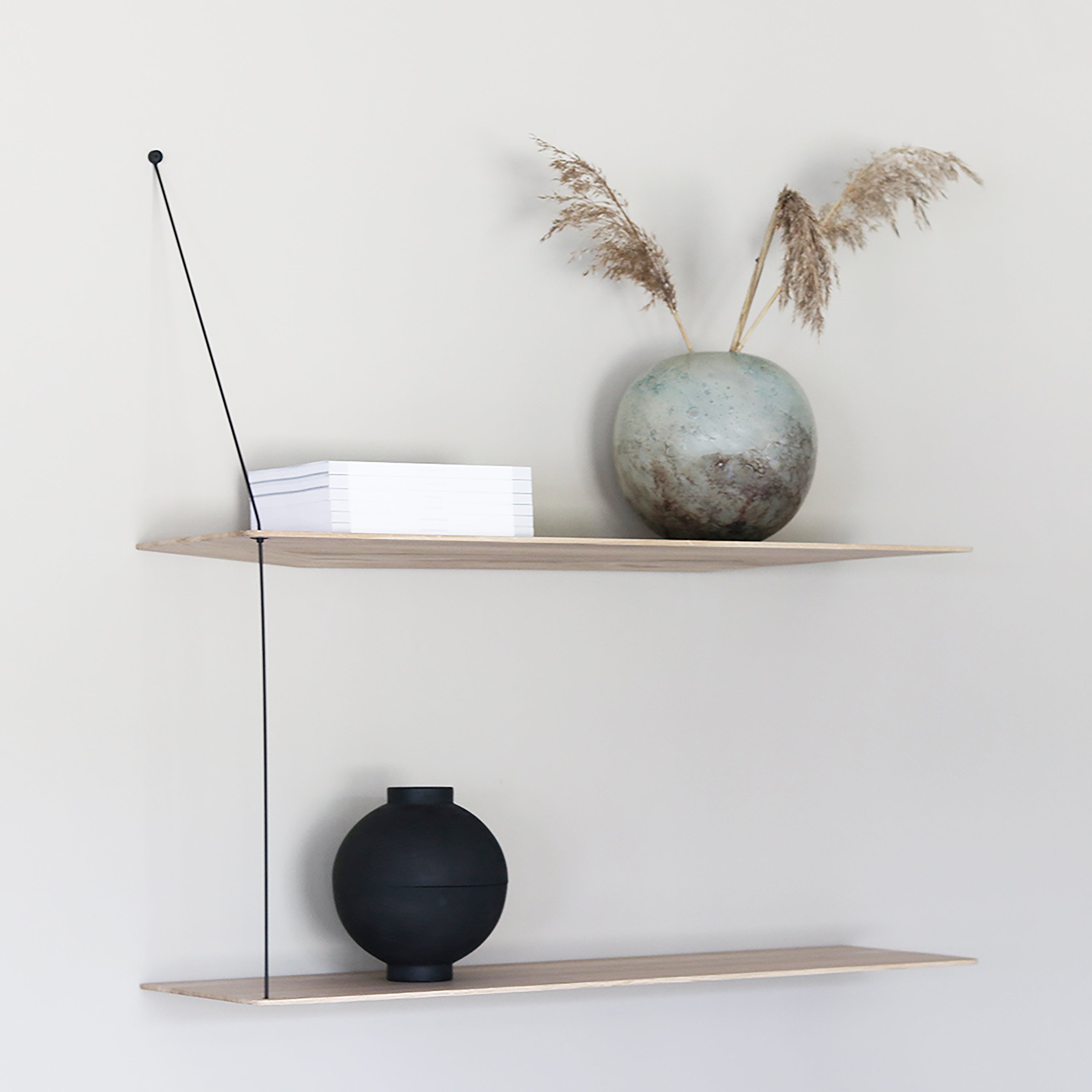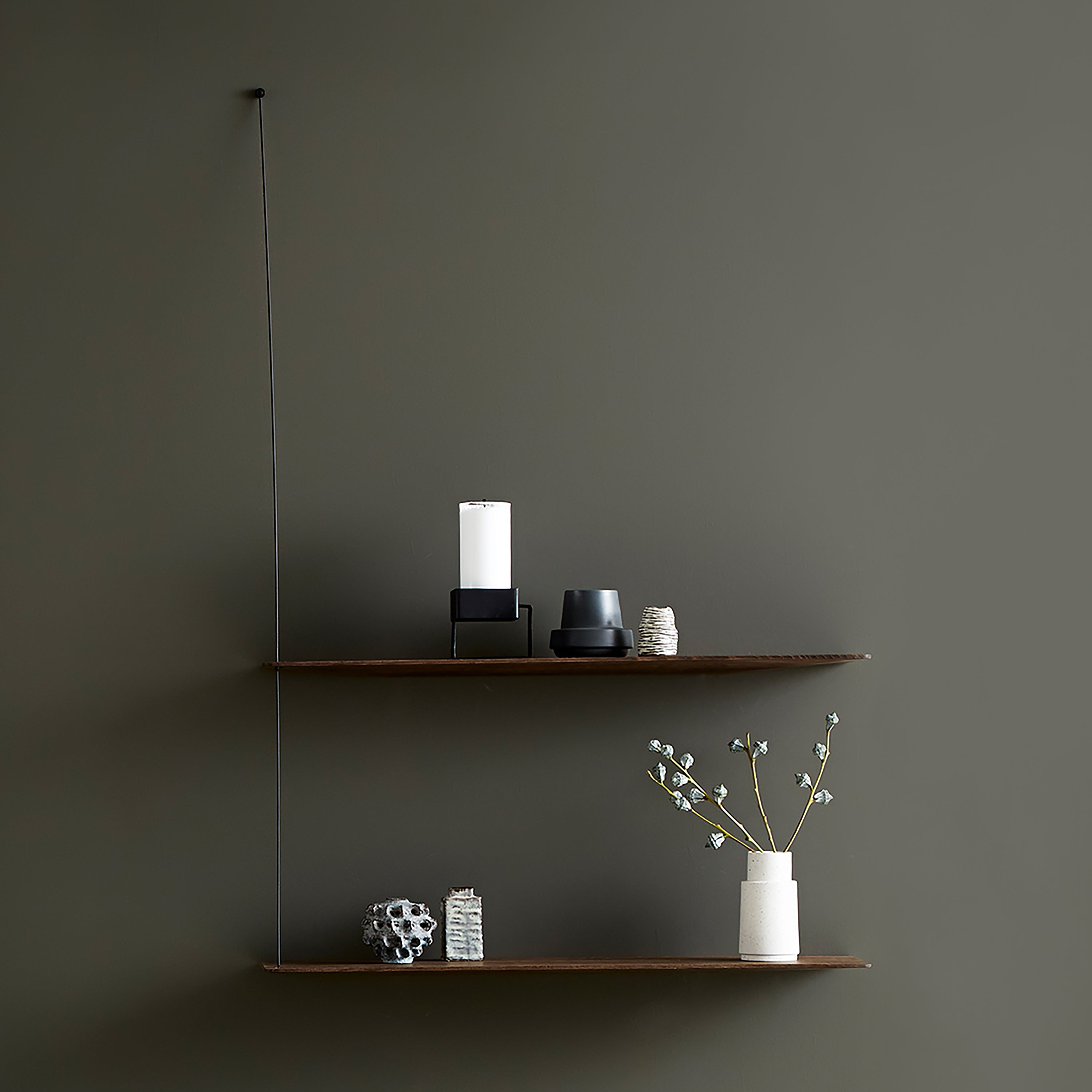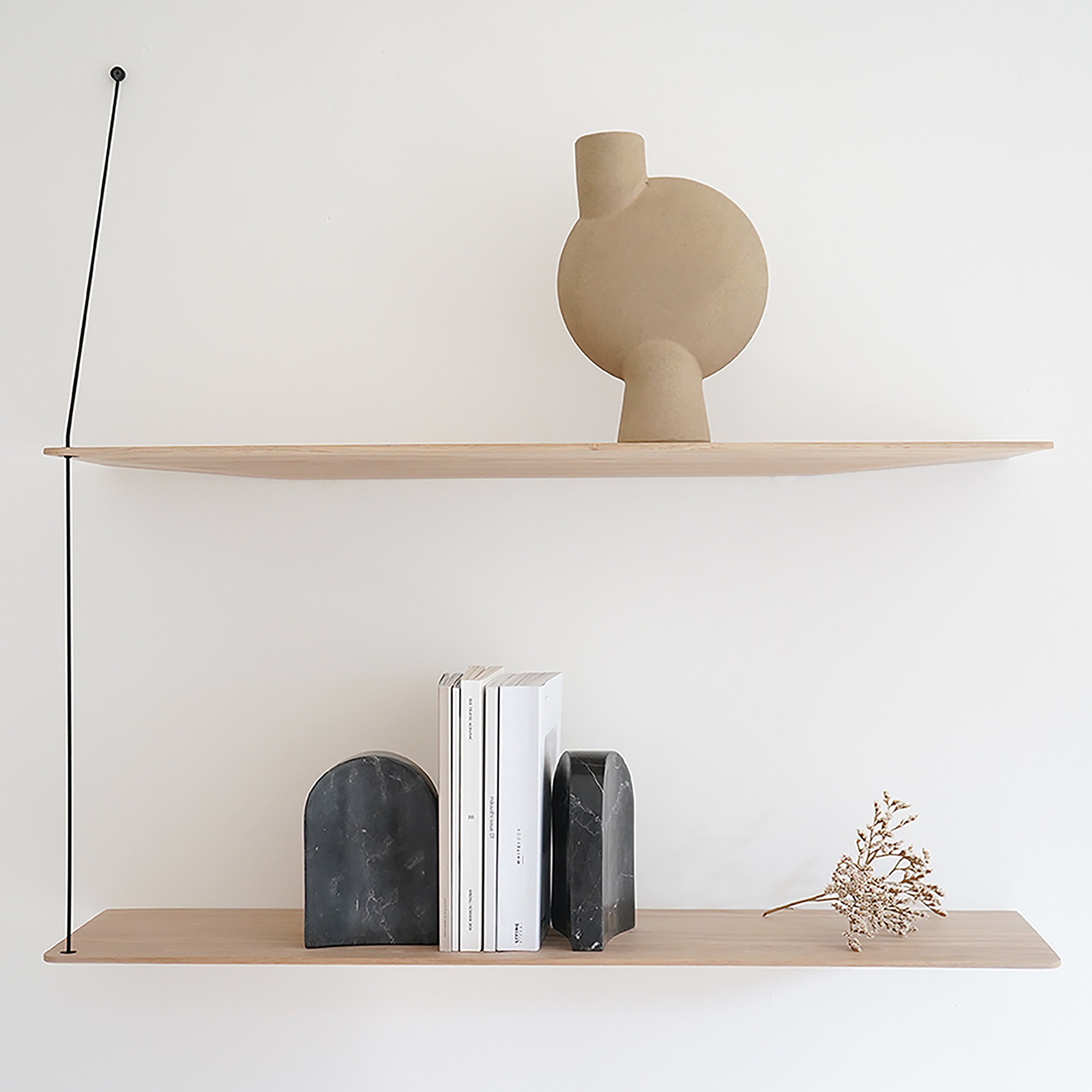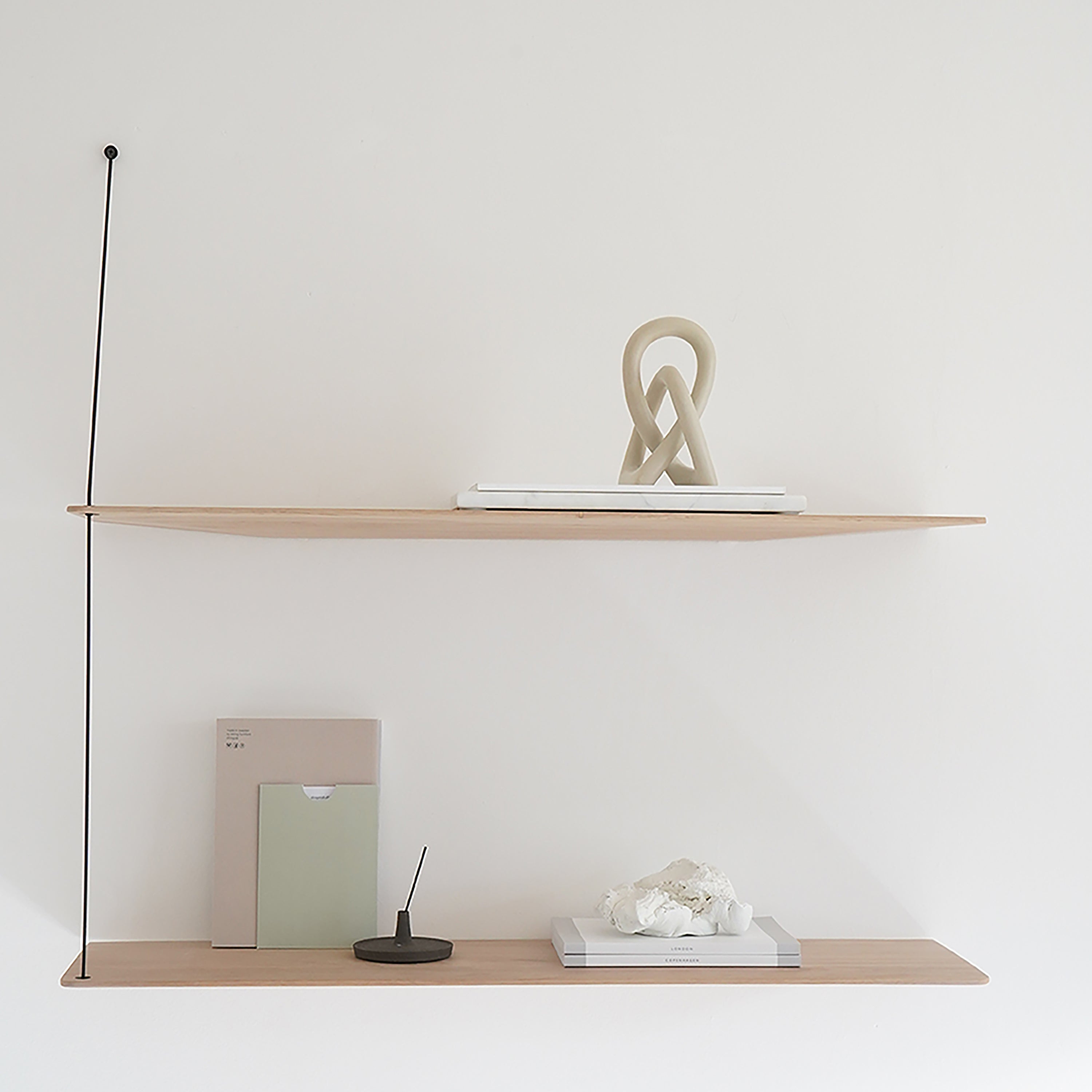Like magic, Woud's Stedge shelving system appears to be held in place by a single cord. This minimalist sleight-of-hand from young German designer Leonard Aldenhoff reveals itself as shelves attached to a wall with screws and connecting metal wires. Light and airy in concept, Stedge comes with 2 slim oak shelves and can be extended with extra shelves purchased separately