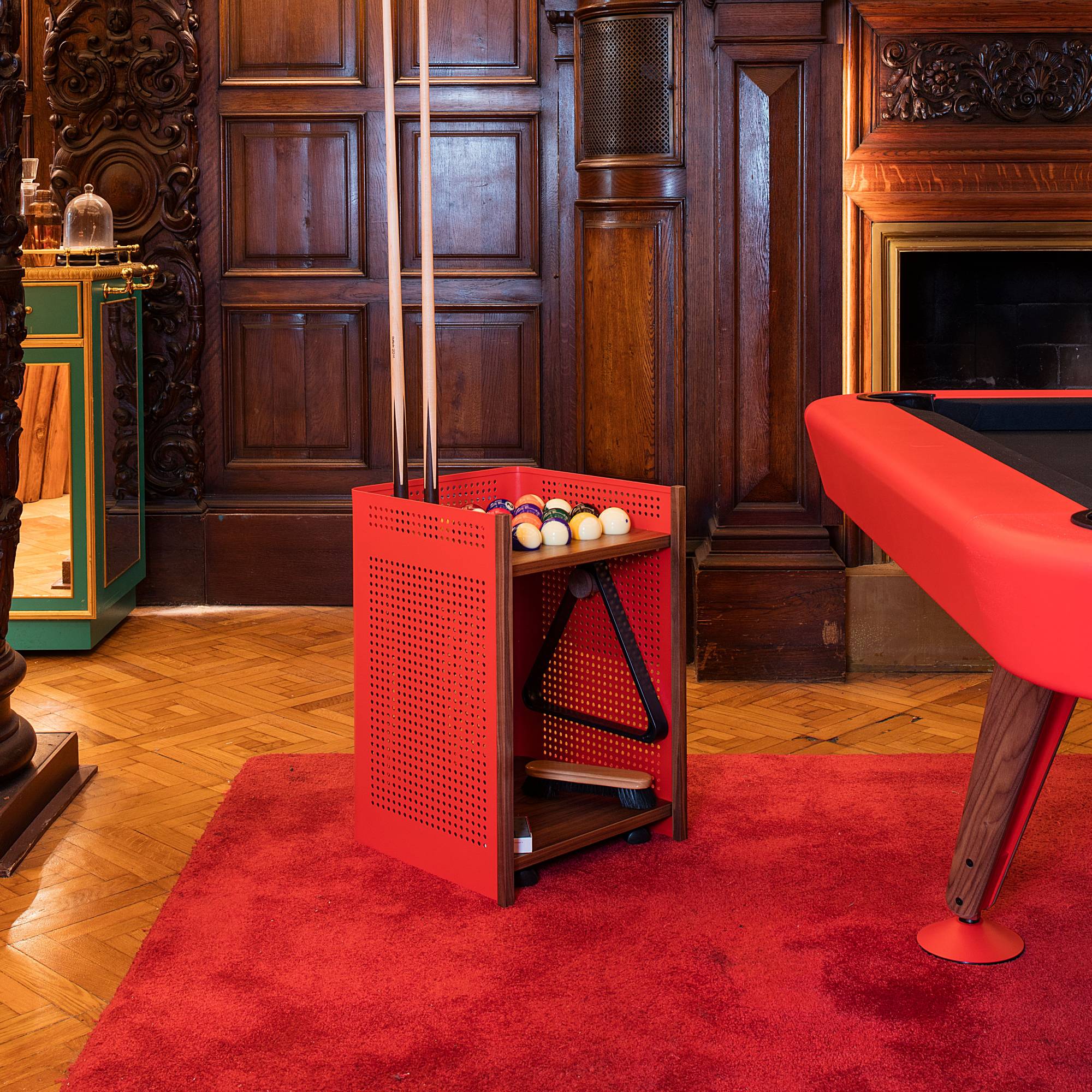 With the same sleek lines as the companion pool table, Yonah’s Diagonal rolling storage rack keeps playing accessories all together and tidy. The wheels allow it to easily moved closer for play or handily stored out of the way when not needed. Crafted in steel finished with durable micro-textured polyester paint, it comes in a choice of 5 colors with a wood storage tray in either iroko, walnut or oak.