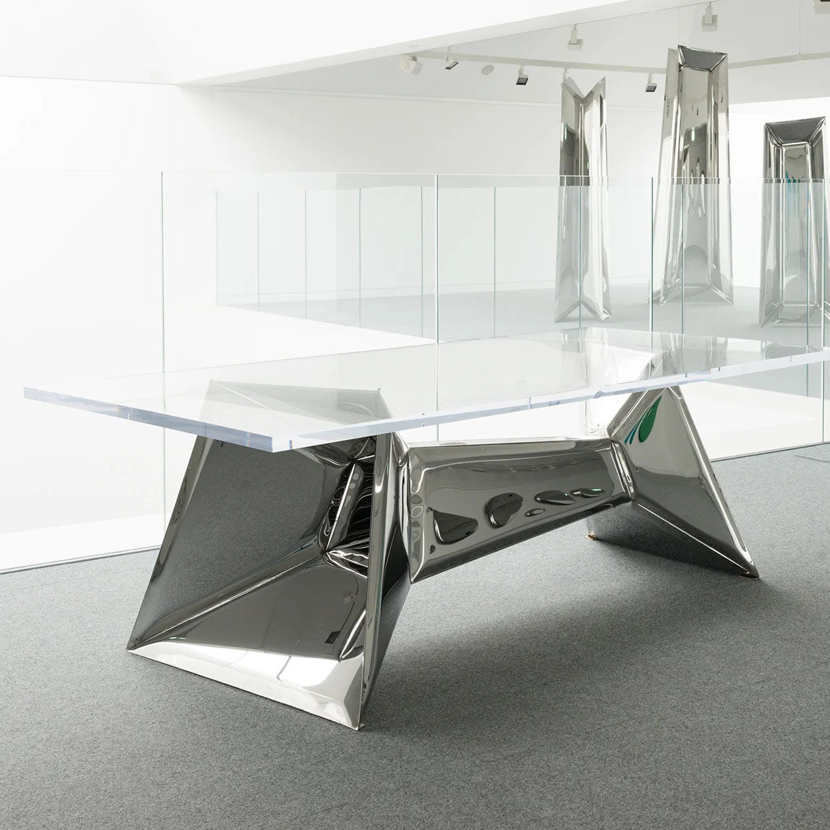 Oscar Zieta's diamond-inspired Crystals motif animates the mirrored stainless-steel base of a spectacular dining table. Polished surfaces curve with the light, creating a stunning game of reflections and shadows—achieved through the designer's ingenious FiDU process in which sheets of metal are welded together and then injected with pressurized air to form a 3-dimensional shape. It's paired with a tabletop in substantial clear acrylic so nothing interrupts the view of this dramatic statement piece.