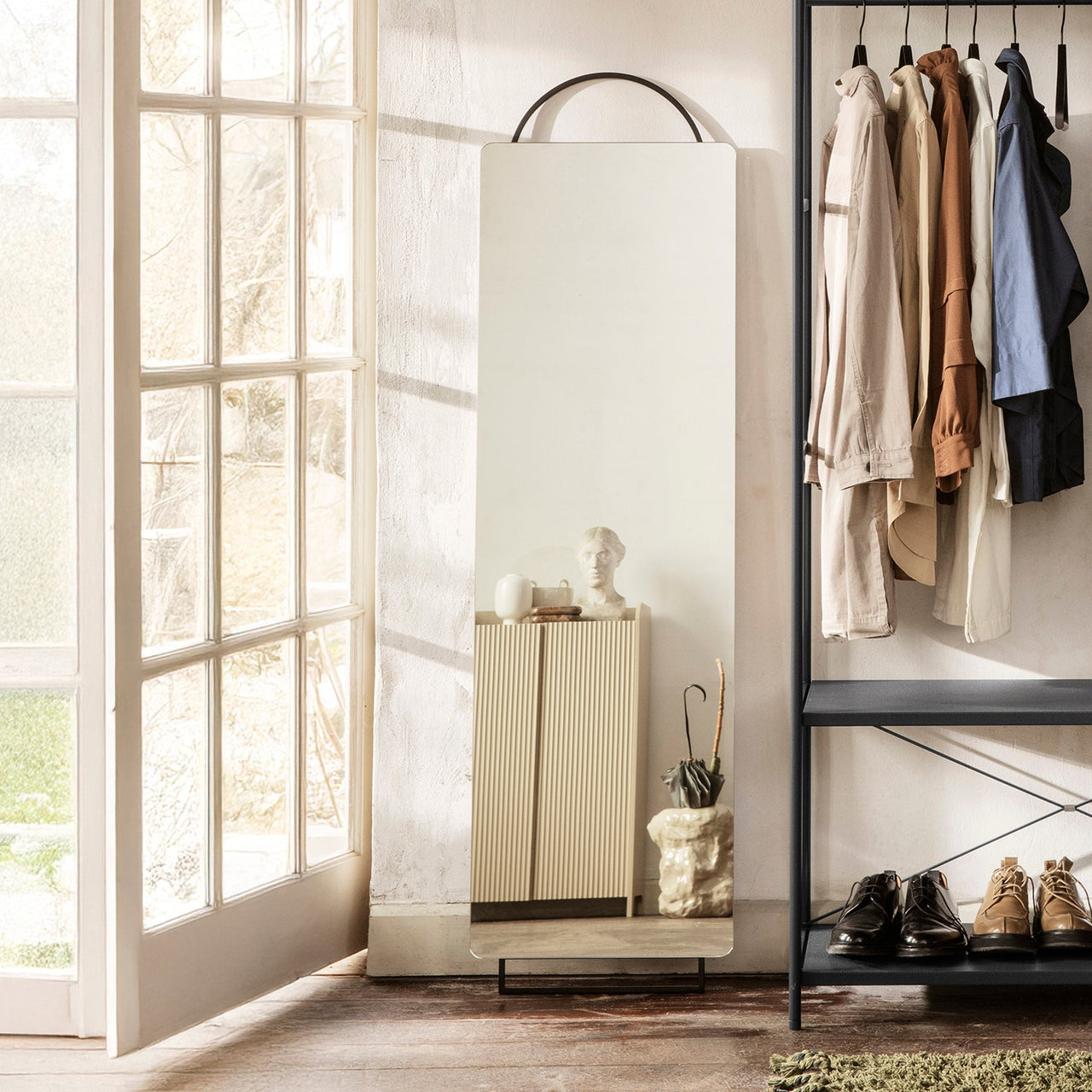 Like a piece of jewelry, this mirror adds a shimmering accent with its metal adornment. The full-length version can be used leaning up against a wall or hung in place while the face mirror could grace a dressing table or be mounted above a powder room sink. In a choice of gleaming brass or modernist black, the metal arc frame makes for an understated fillip.