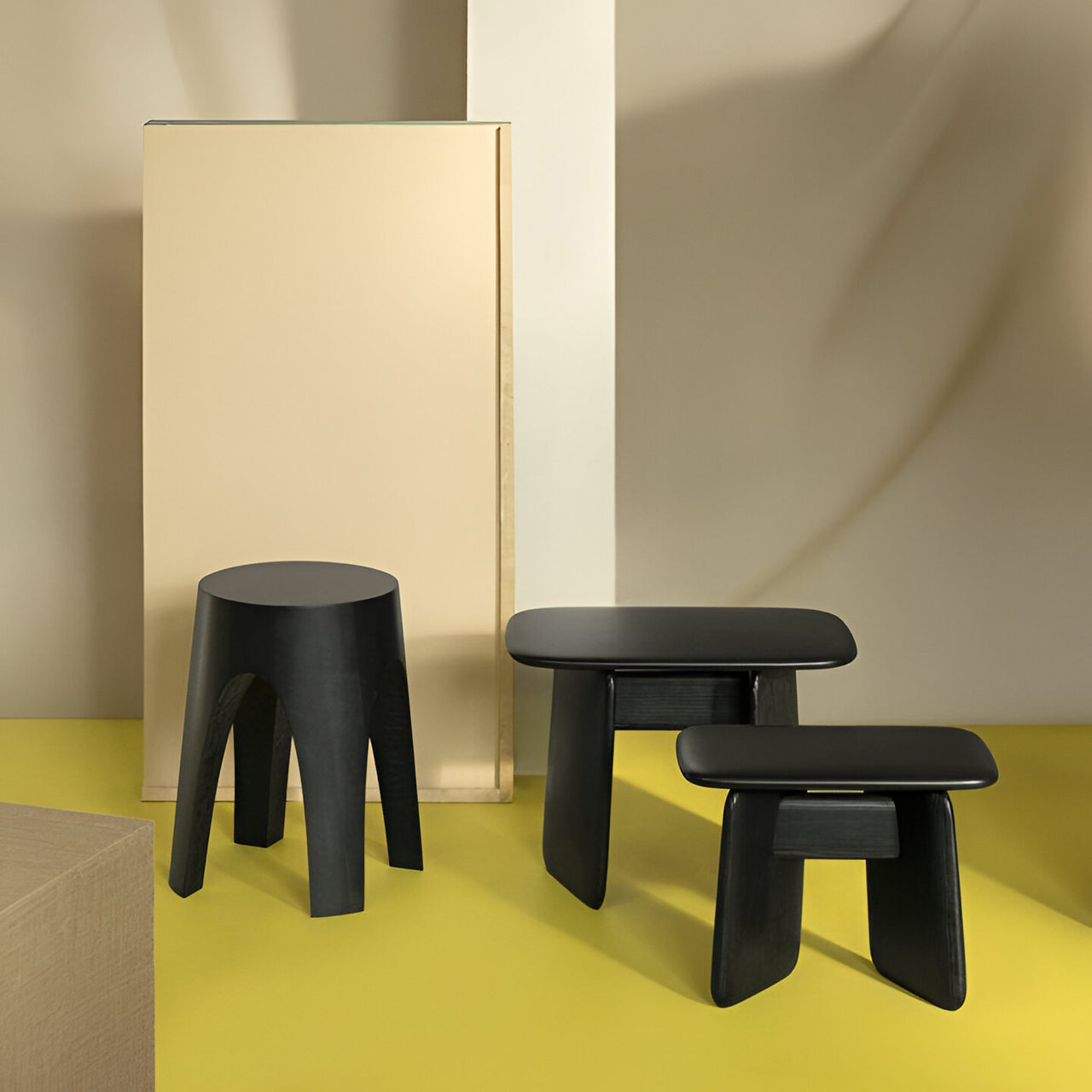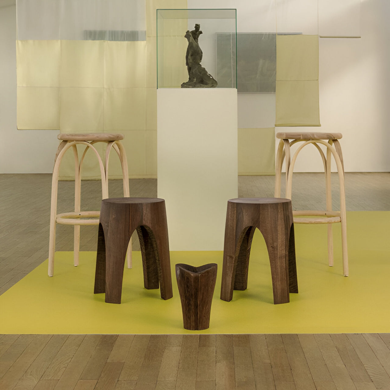 This hand-carved wooden stool is shaped from a single log, with arch-like legs inspired by the bridge of Mostar. The underside is detailed with intricate carvings that suggest the rippling movement of the Neretva River. Each piece highlights the character of solid walnut, maple, or ash, offered in a range of finishes. The result is both a functional seat and a sculptural object, where traditional carving techniques bring depth and individuality to every stool.
