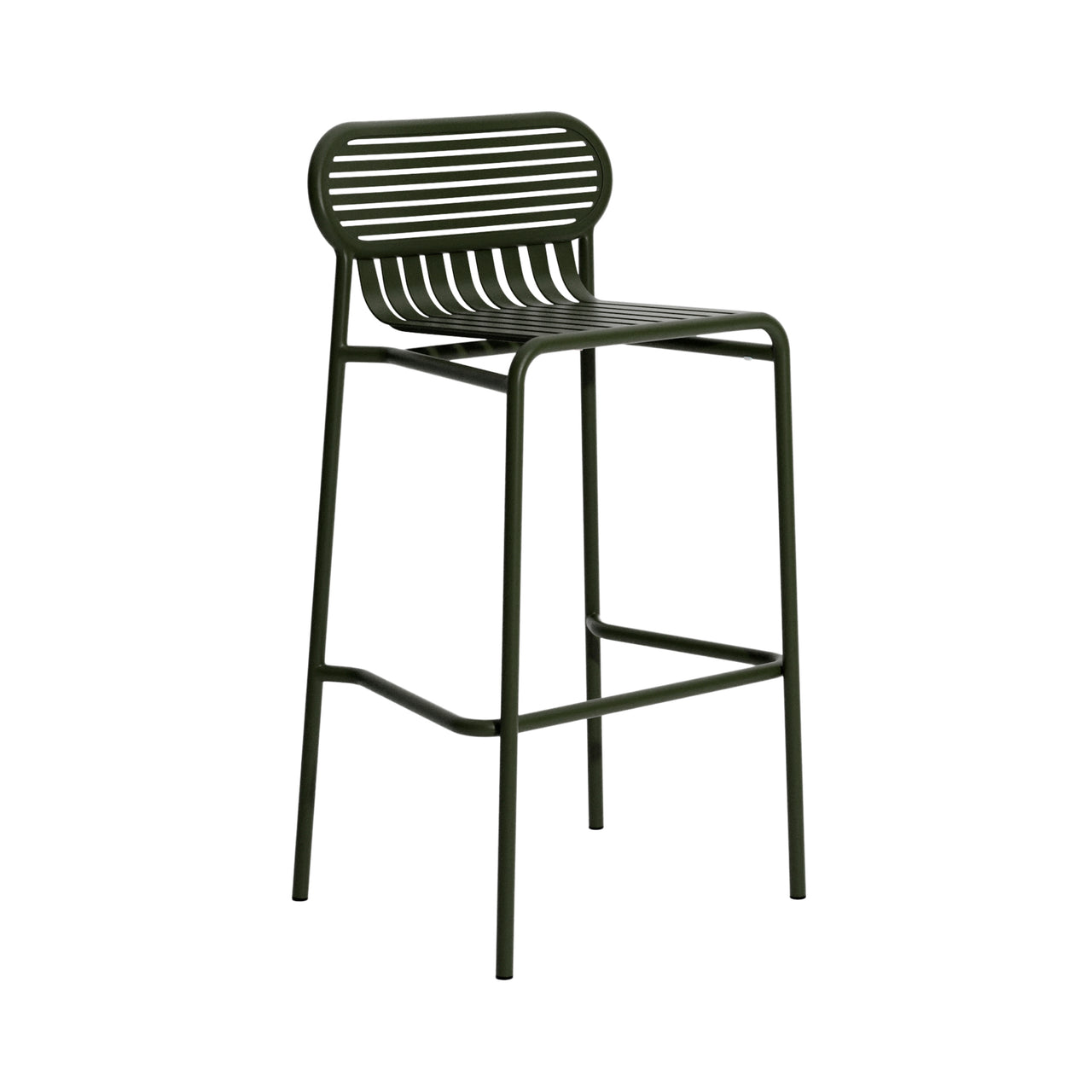 Week-End collection’s signature slat-motif seating adds a stackable high stool to pair with its corresponding bar table. Studio BrichetZiegler repeats the series’ familiar oval backrest and graphic mix of horizontal and vertical “stripes” fashioned in lightweight but durable aluminum. Also in the mix: Petite Friture’s delectable range of colors in an anti-UV powder coat with a matte finish.