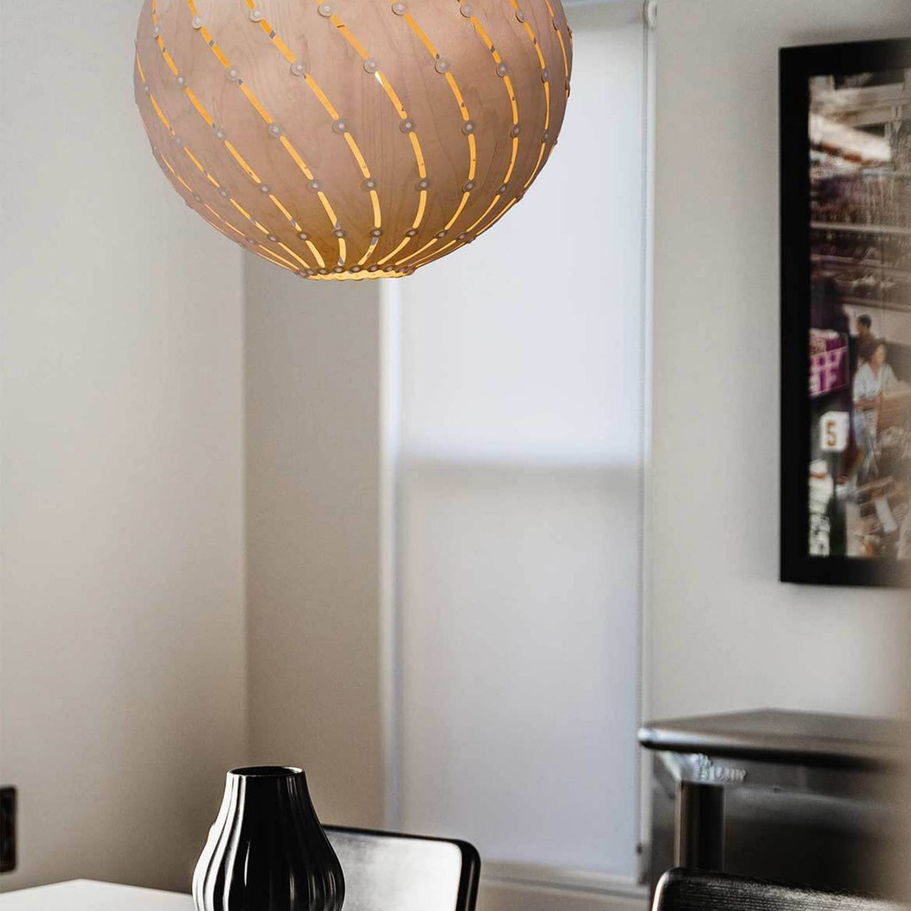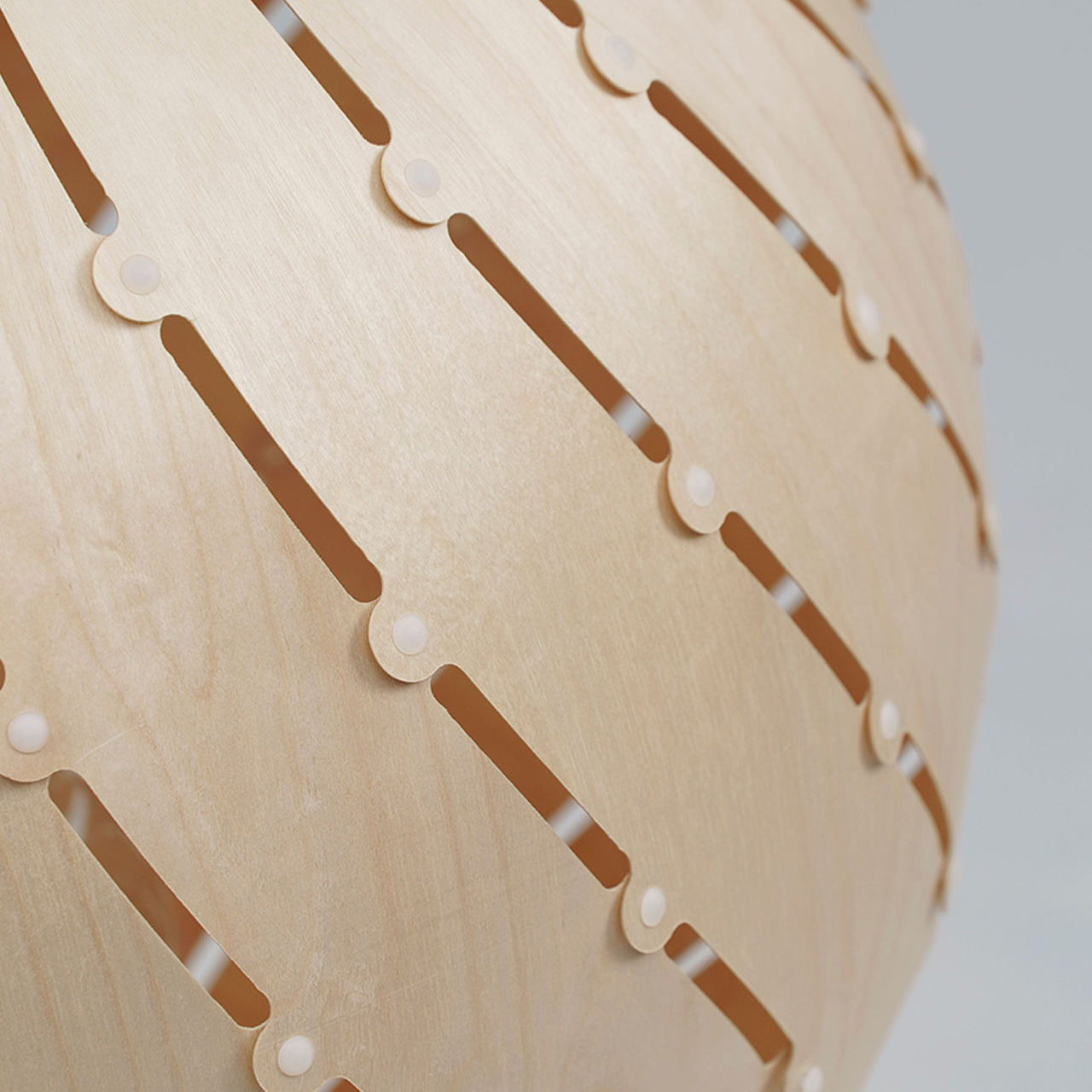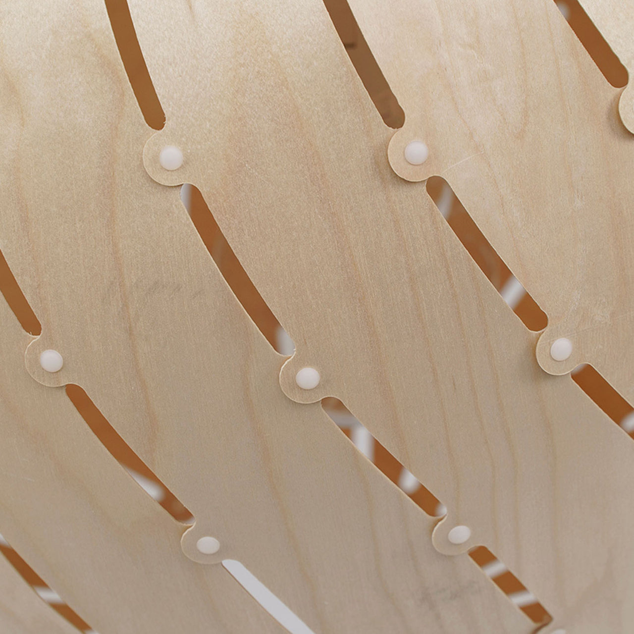 Eco-conscious designer David Trubridge up the game in his Ebb series with Bounce, a round pendant with his signature wavy ripple of pattern. Newly conceived in a more sustainable ultra-thin Finnish birch plywood, the sphere is held together with nylon clips, and its light spreads a warming nimbus while also complementing the natural woodgrain. Shipped as an unassembled flat "kitset" in environmentally friendly packaging, it includes a cord-bulb holder and a ceiling canopy.