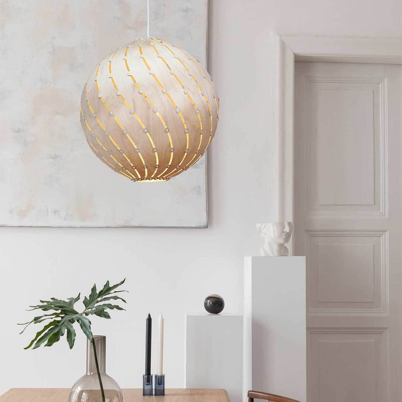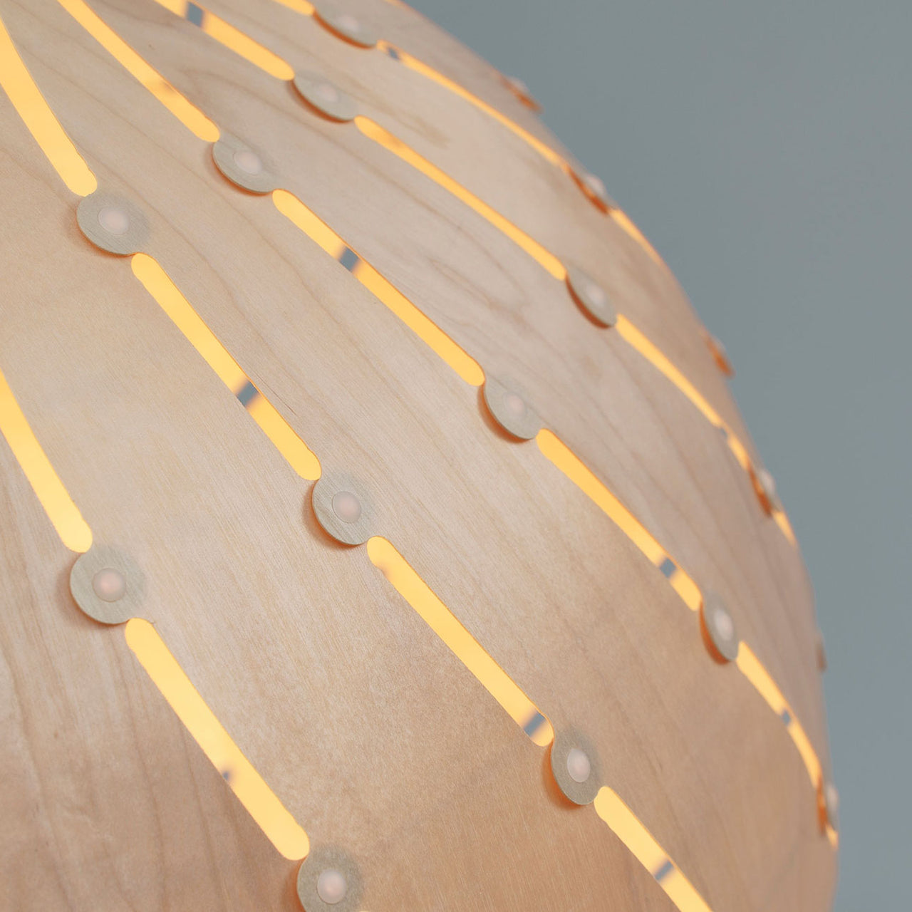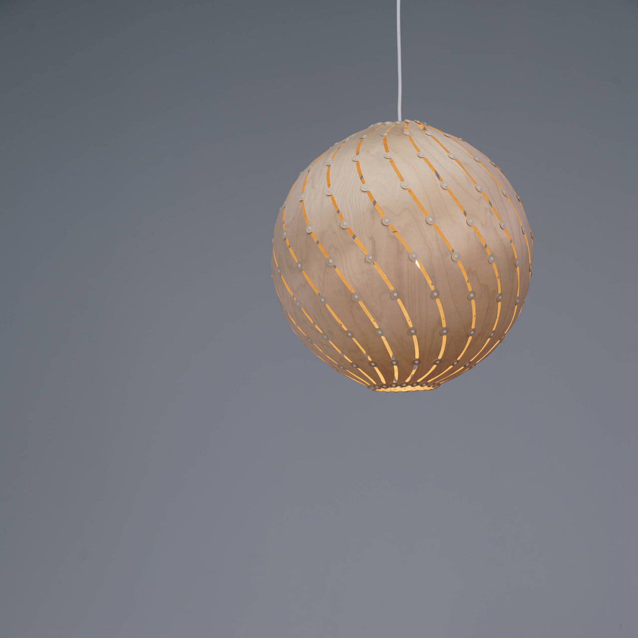 Eco-conscious designer David Trubridge up the game in his Ebb series with Bounce, a round pendant with his signature wavy ripple of pattern. Newly conceived in a more sustainable ultra-thin Finnish birch plywood, the sphere is held together with nylon clips, and its light spreads a warming nimbus while also complementing the natural woodgrain. Shipped as an unassembled flat "kitset" in environmentally friendly packaging, it includes a cord-bulb holder and a ceiling canopy.