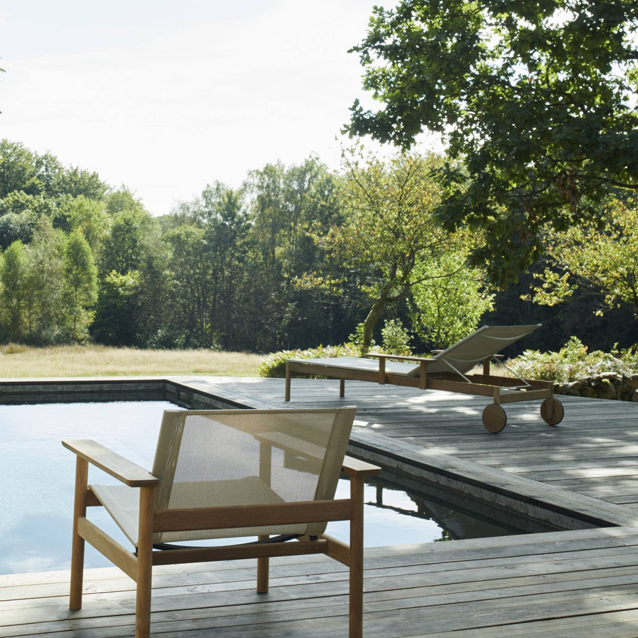 Aptly named for the Greek word for the sea, the Pelgao collection adds a crisply styled chaise that can be set in 5 positions—for lying down, reclining or sitting. Sunbed features a sleek solid-teak frame crafted from FSC-certified sustainable sources with matching wooden wheels, making it easy to move and follow the sun. The weatherproof Sling fabric seat brings a lightness and transparency and can be paired with a foam cushion covered in honey-toned weatherproof Sunbrella fabric.
