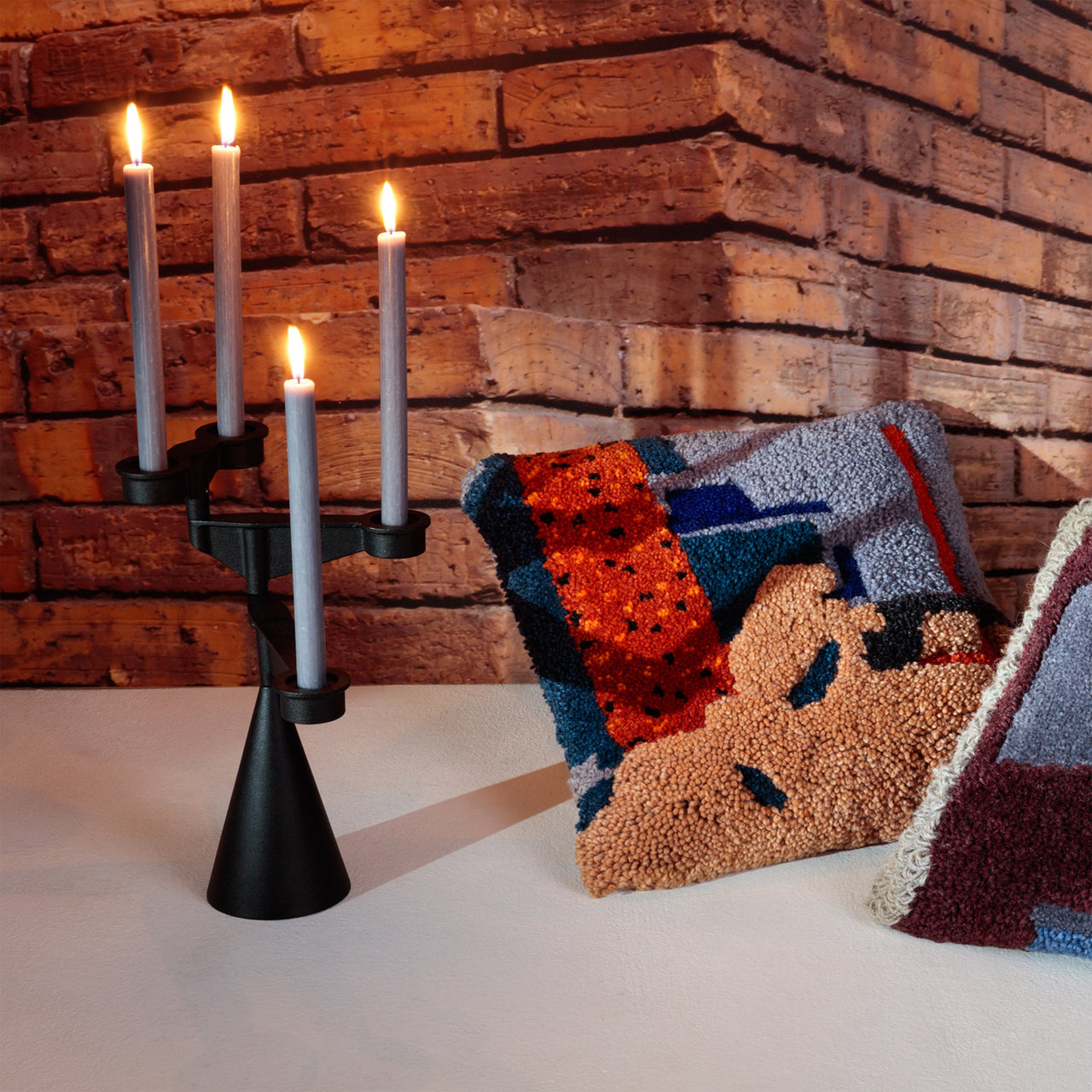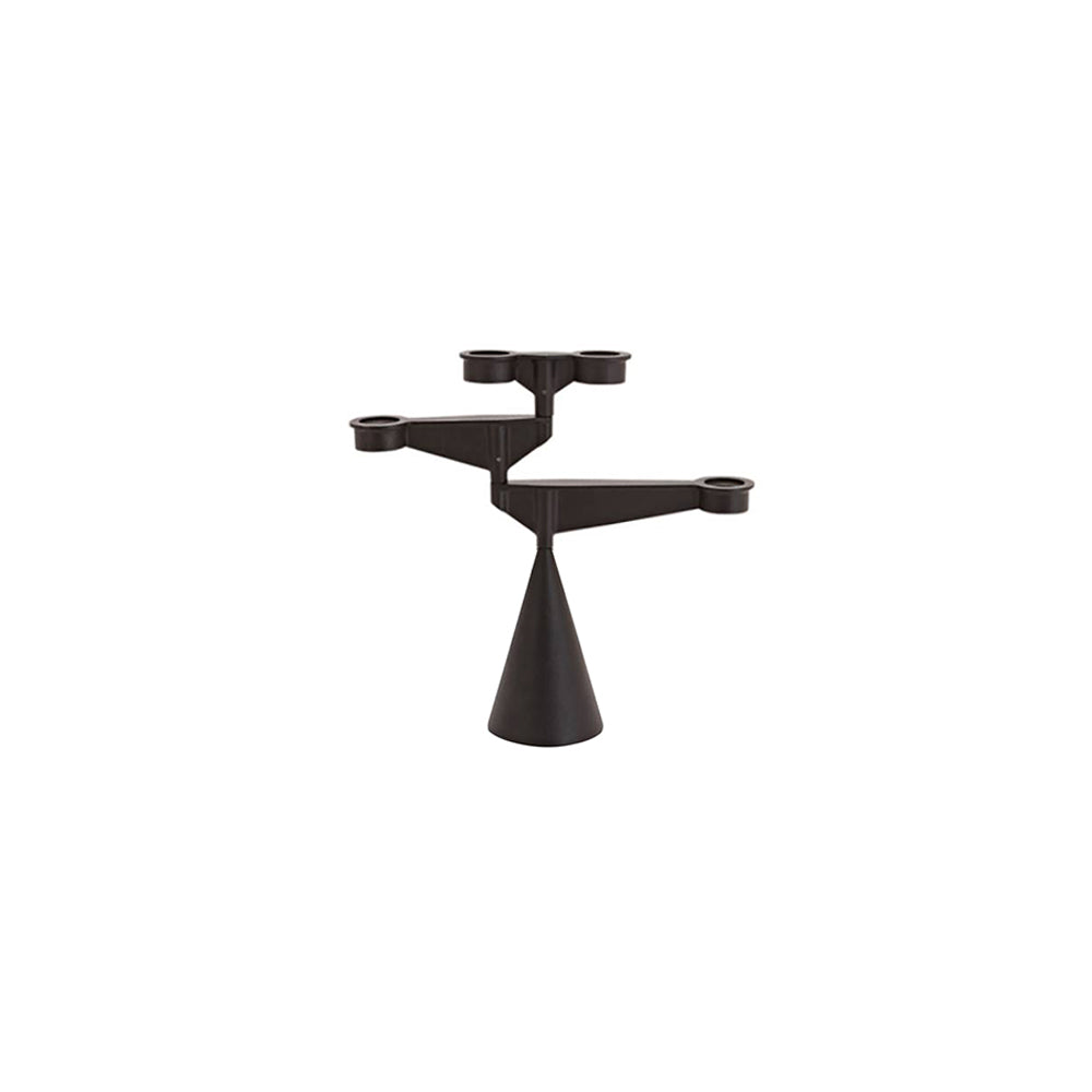 Inspired by the industrial age, Spin is a starkly kinetic candelabra made from cast iron, machined and finished entirely in Great Britain. Weighted arms swing around via cast ball bearings for infinite arrangements. In black powder coat to emphasize the distinctive silhouette, the candle holder's sockets can hold either tea lights or taper candles.