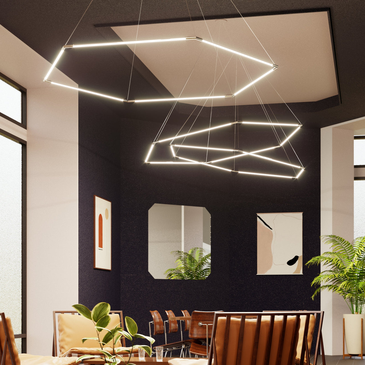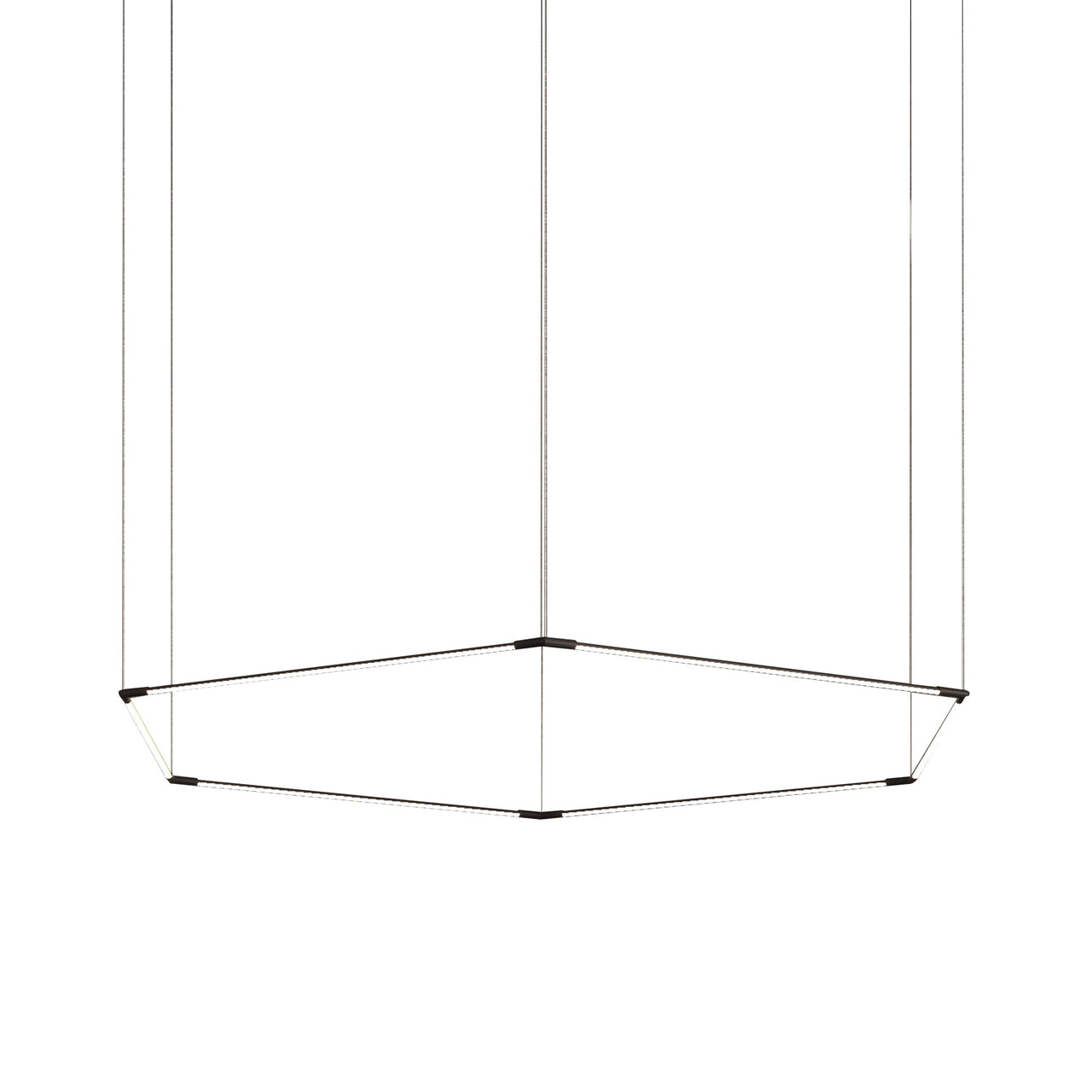 This geometric shape is a stunning variation on Peter Butler’s signature Thin Primaries lighting system for Juniper Design. Available in either suspended or wall-mounted options, it creates a mesmerizing silhouette while still providing functional lighting for commercial, residential or hospitality settings. Individual fixtures can be clustered, expanded or interlocked to easily create custom installations with its fully rotatable light segments and magnetically connecting ends.