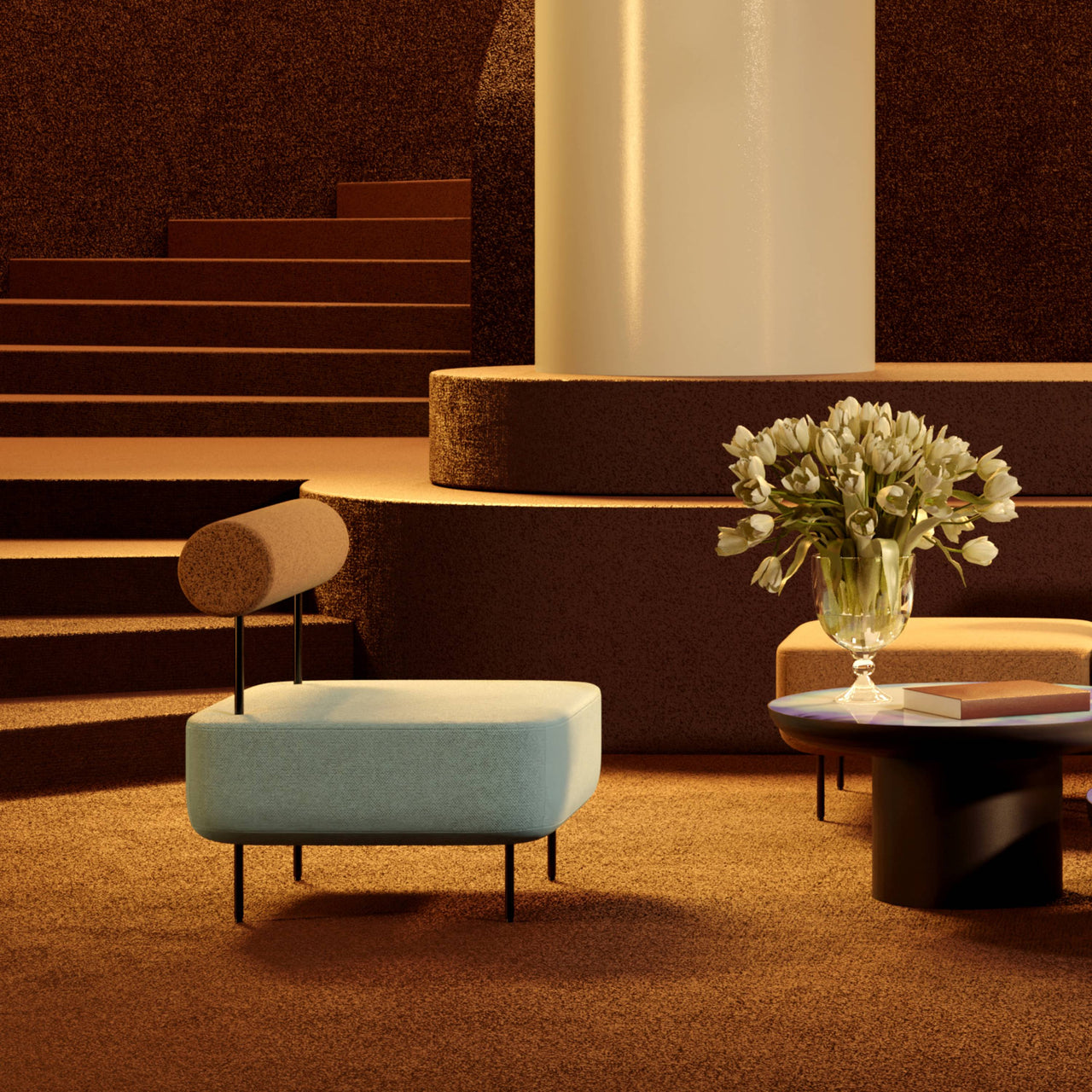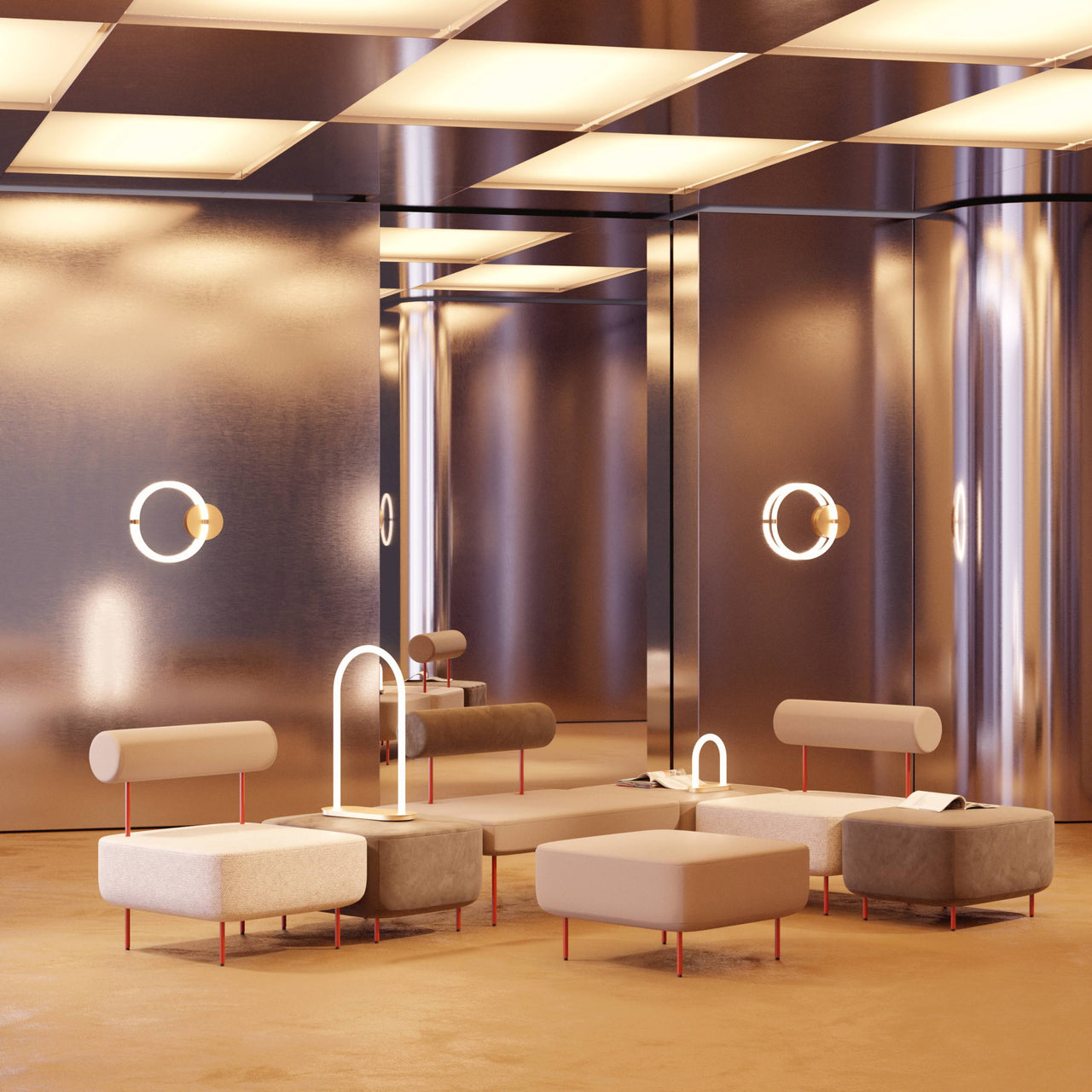 Hoff, a characterful take on modular furniture, features this medium armchair with a deeply padded but narrower seat than its sister larger model. Along with 2 modular stools, say Norwegian design duo Morten & Jonas, the pieces can be variously combined to create a sofa or even fill an entire living room. Hoff is readily characterized by its square seat and tubular backrest—available in matching or contrasting upholstery—along with slender tubular steel legs in red or black enamel.